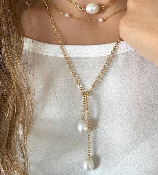 Pearl tie lariat with freshwater pearls and 14KT Gold filled