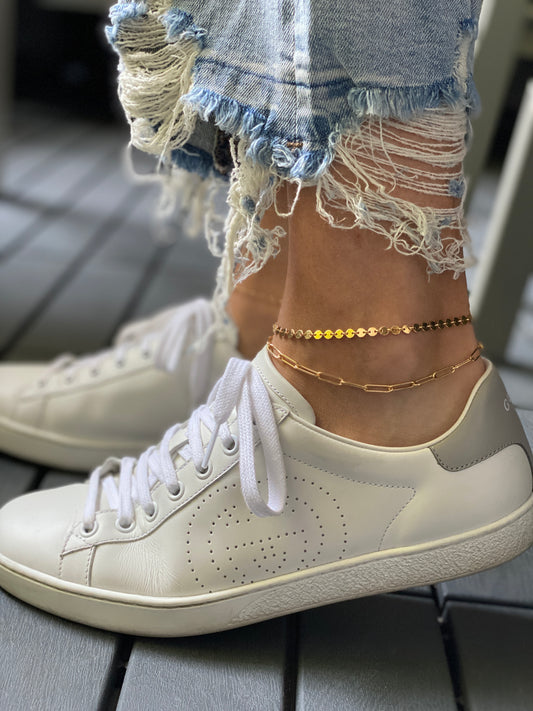 The Mila disc chain anklet in 14KT Gold filled.