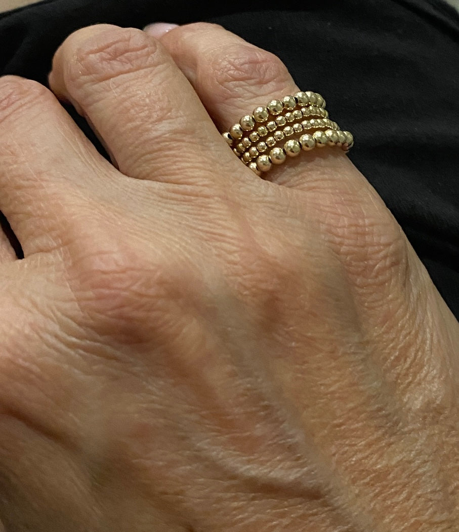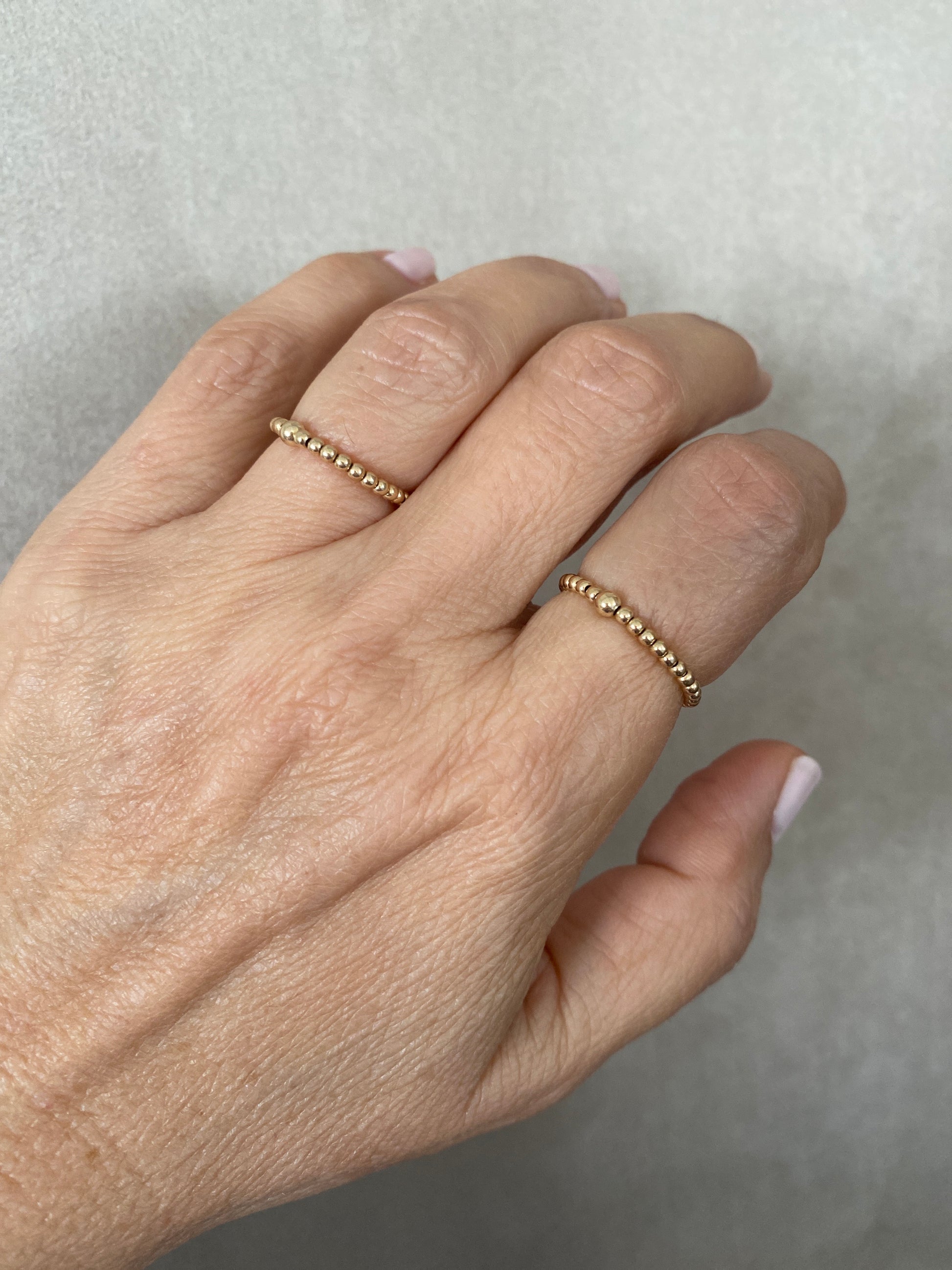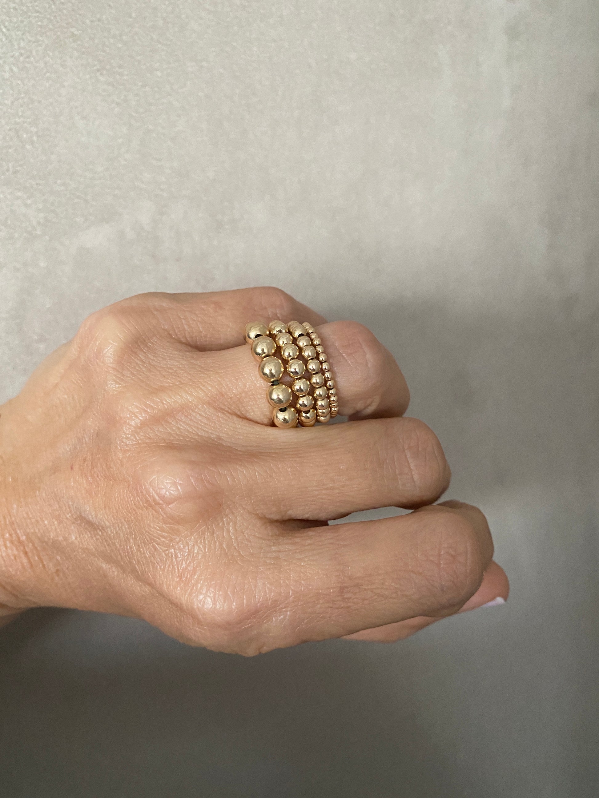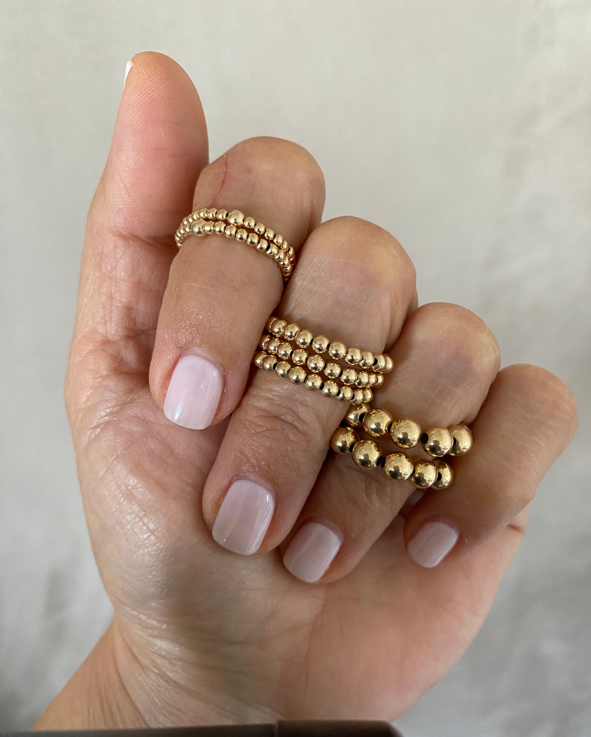 Crafted with 14 karat gold-filled beads, the Capri Gold ball stacking rings come in four bead sizes (2mm, 3mm, 4mm, 5mm) and in ring sizes 6, 7, and 8. Listing is for one ring.