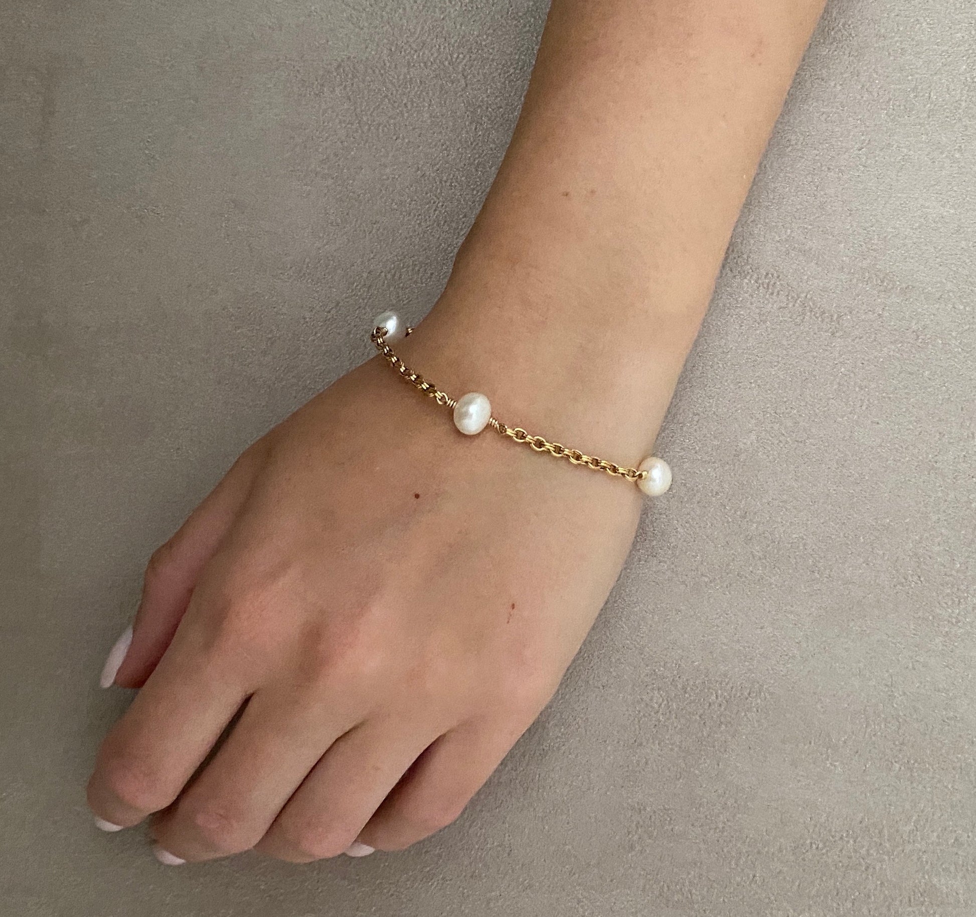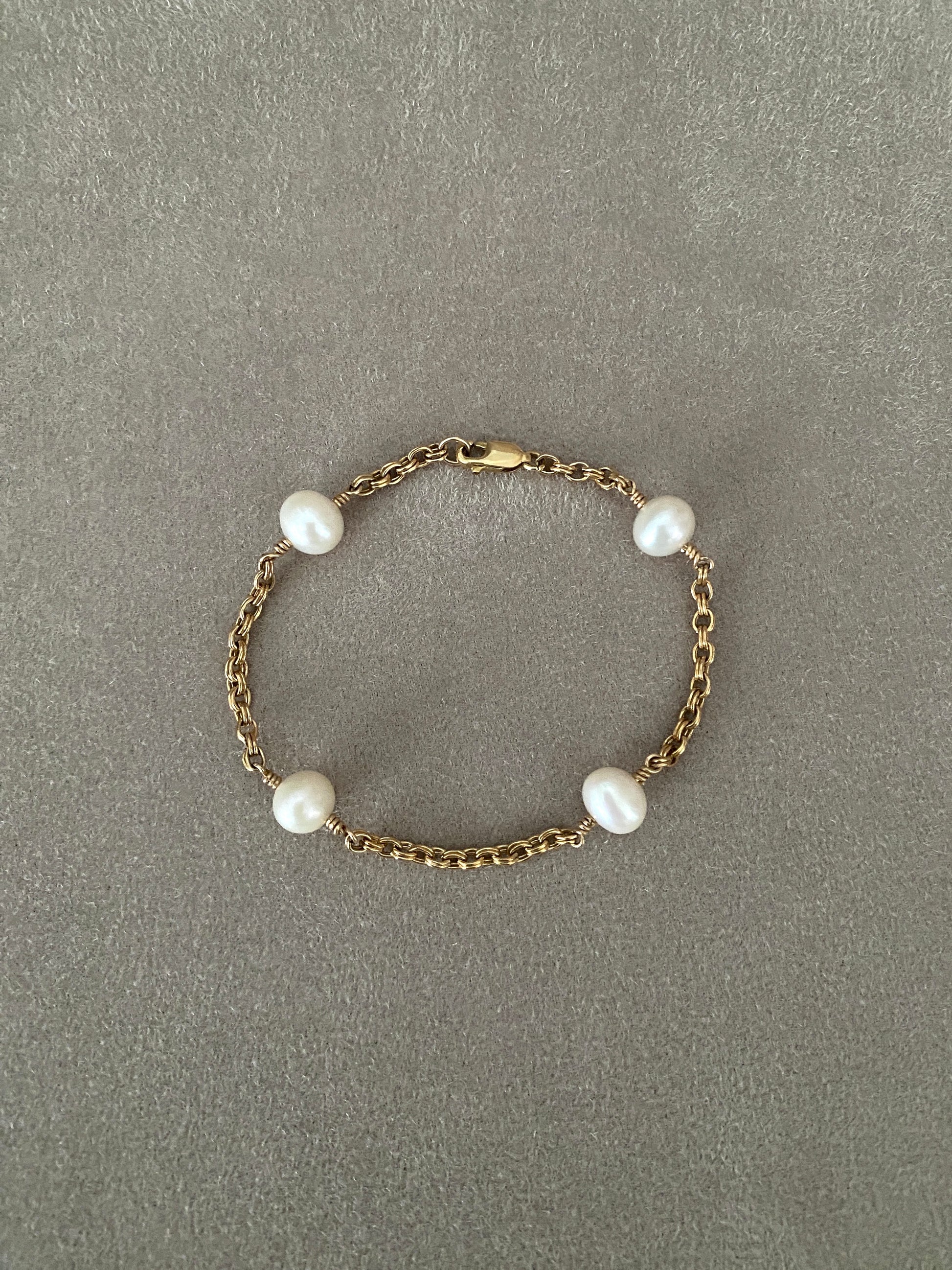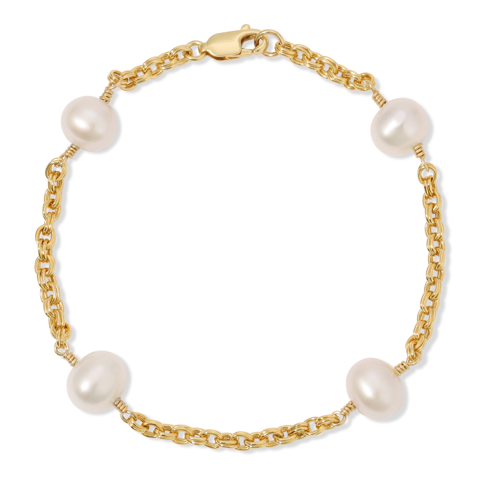 The Celine bracelet is made using four 8-9mm freshwater pearls wire wrapped into a beautiful double link chain. Measures 7.5" end to end.