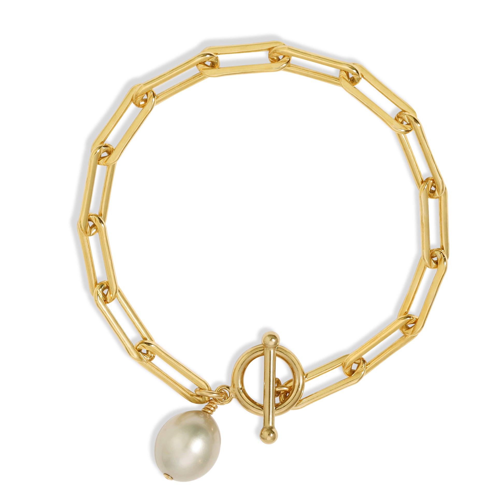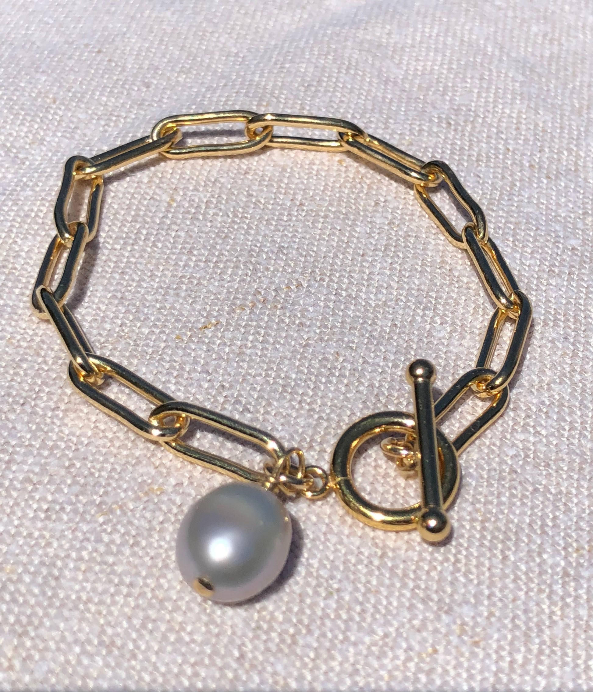 The Chloe Paperclip Link Toggle Charm Bracelet is crafted from 14KT Goldfilled paperclip links and toggle clasp, featuring a grey freshwater pearl charm.