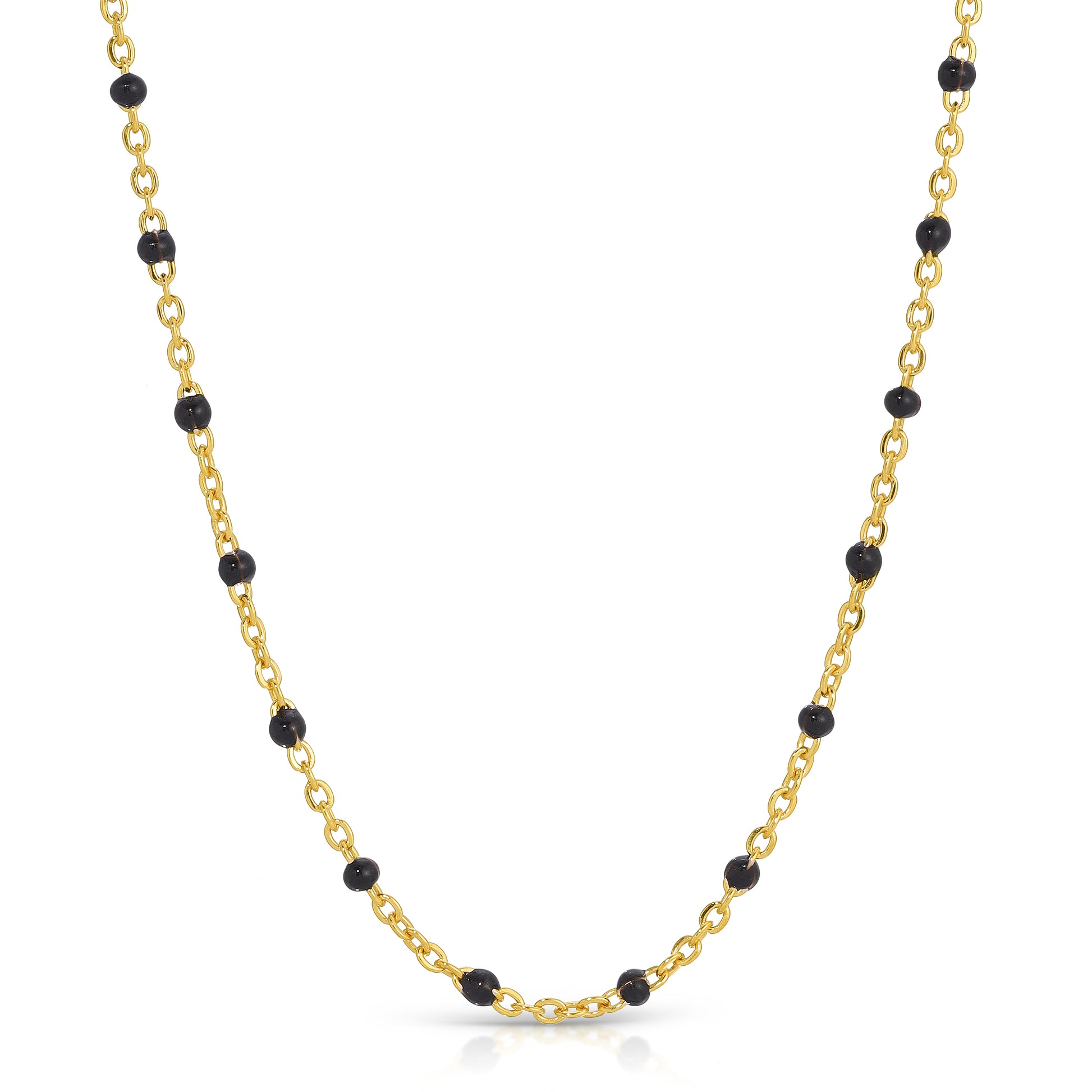 The Fiji necklace features a dainty 14KT Goldfilled chain with Black enamel beads and hand-wired endings for lasting quality. Measures 17" from end to end.