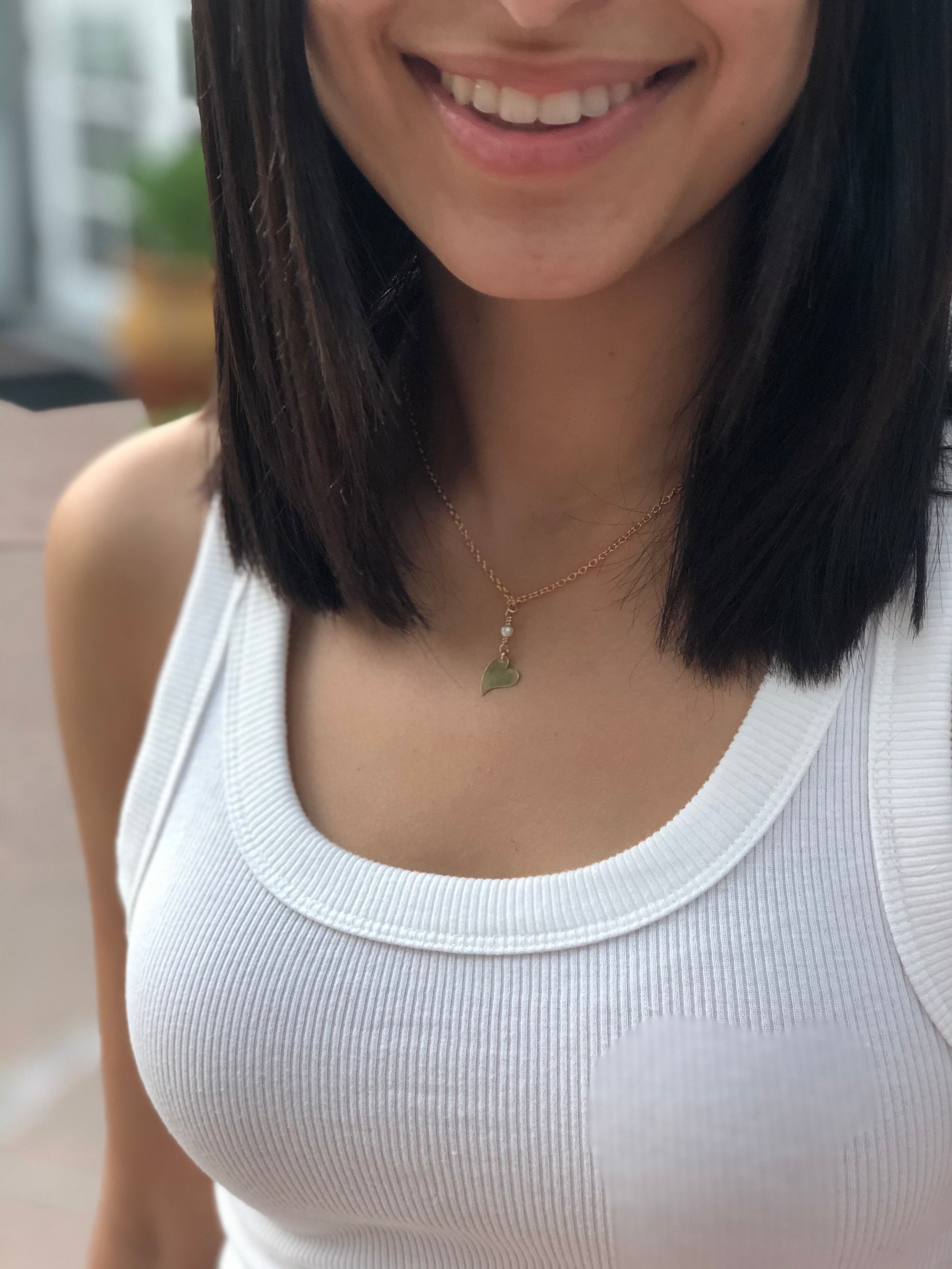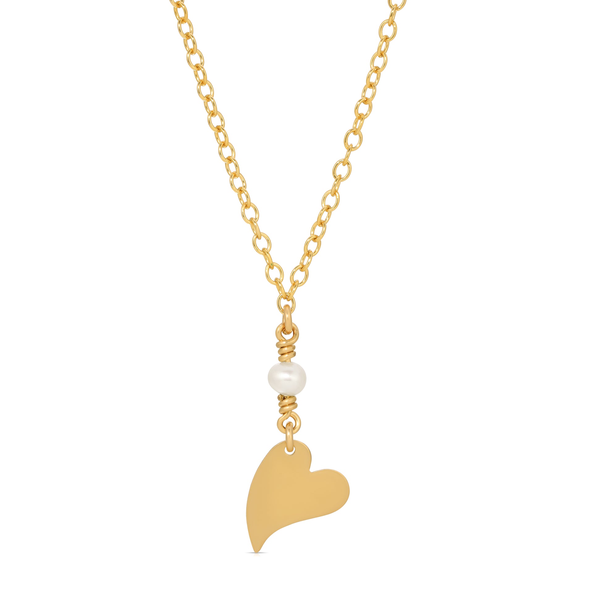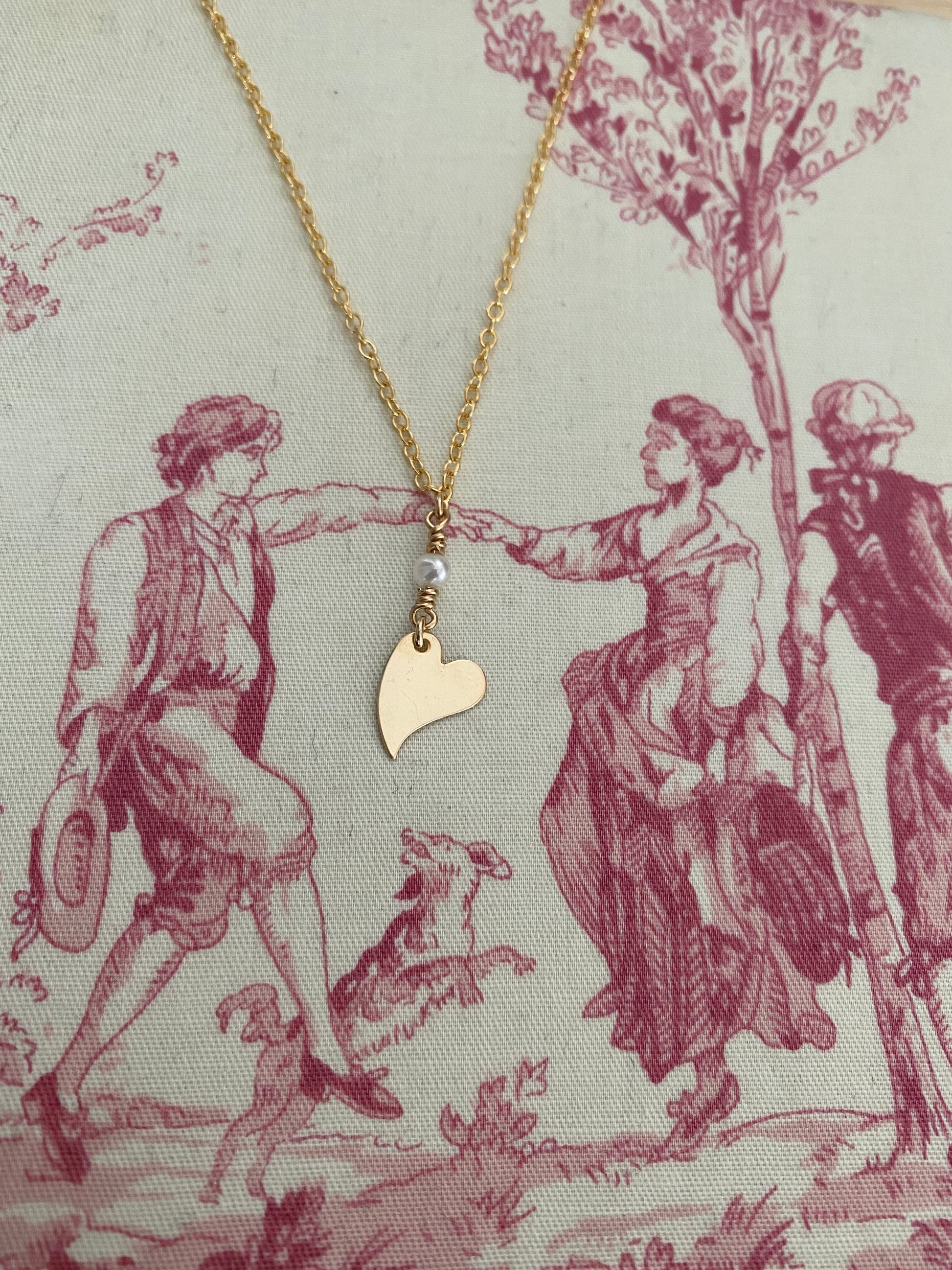 The Cora pearl crowned heart necklace is made entirely in 14KT Gold filled and a handwired freshwater pearl crowning the heart charm. Measures 16".