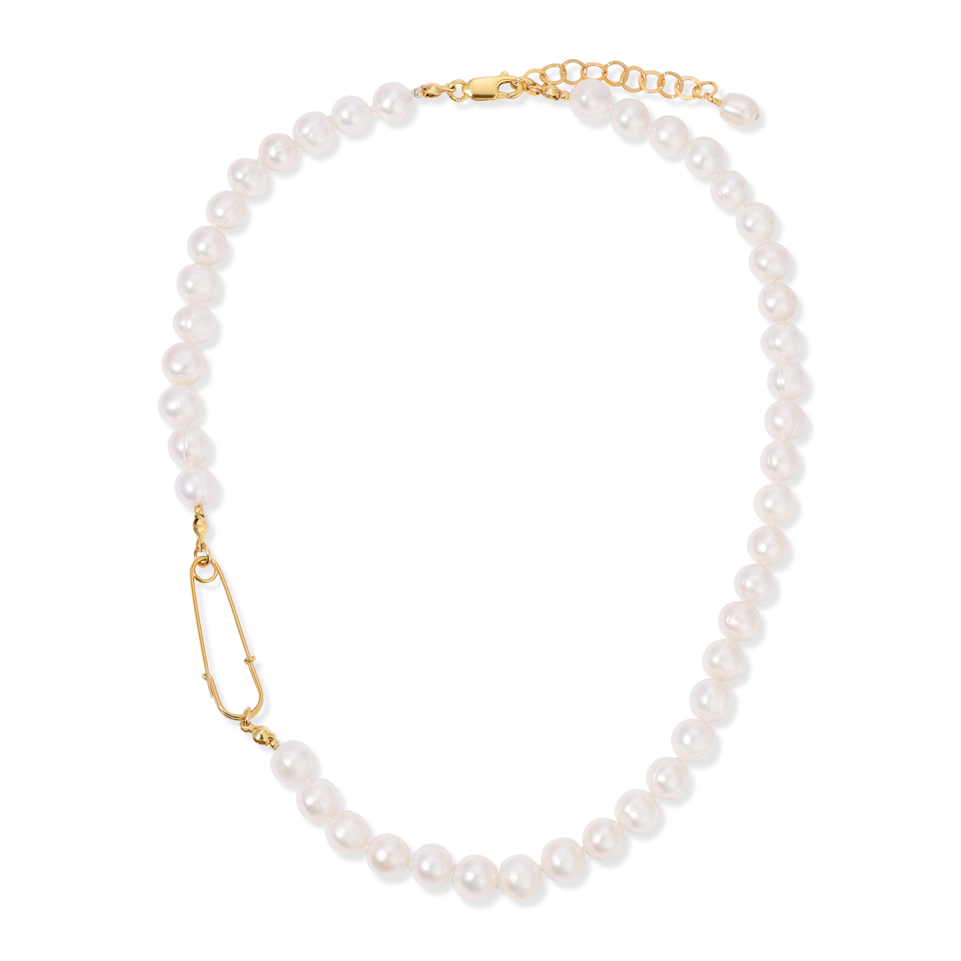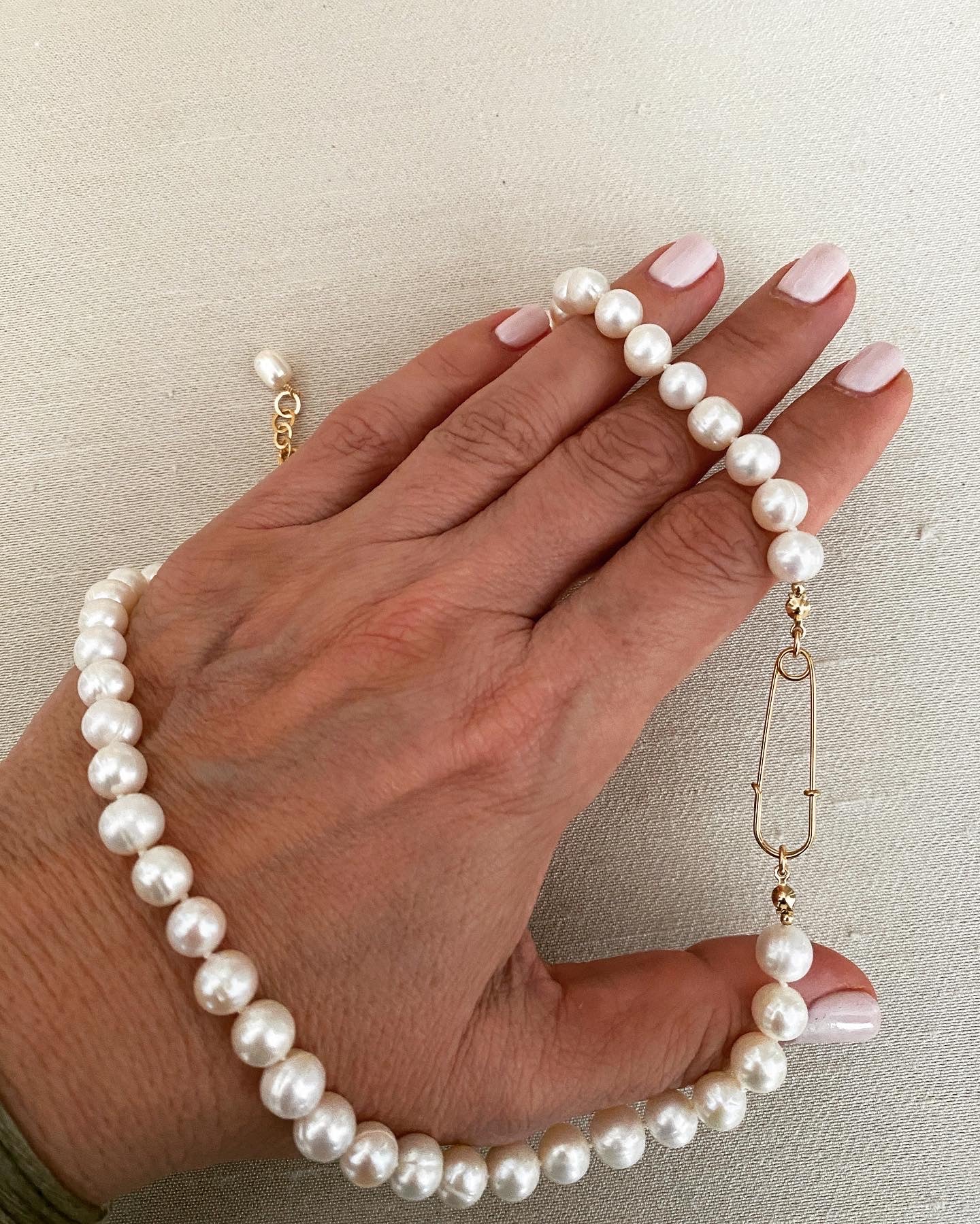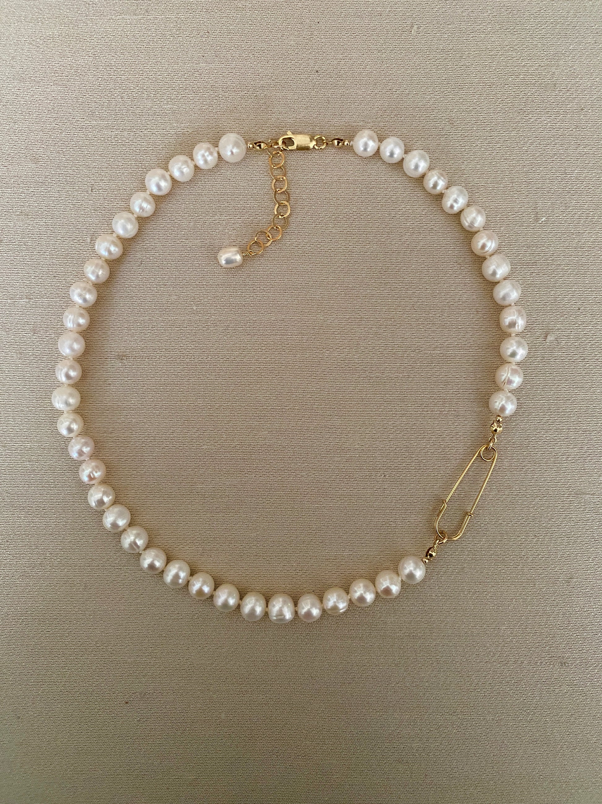 An Edgy yet feminine necklace made with Freshwater baroque pearls and 14KT Gold filled safety pin detail. Measures measures 19” including 2” extension.