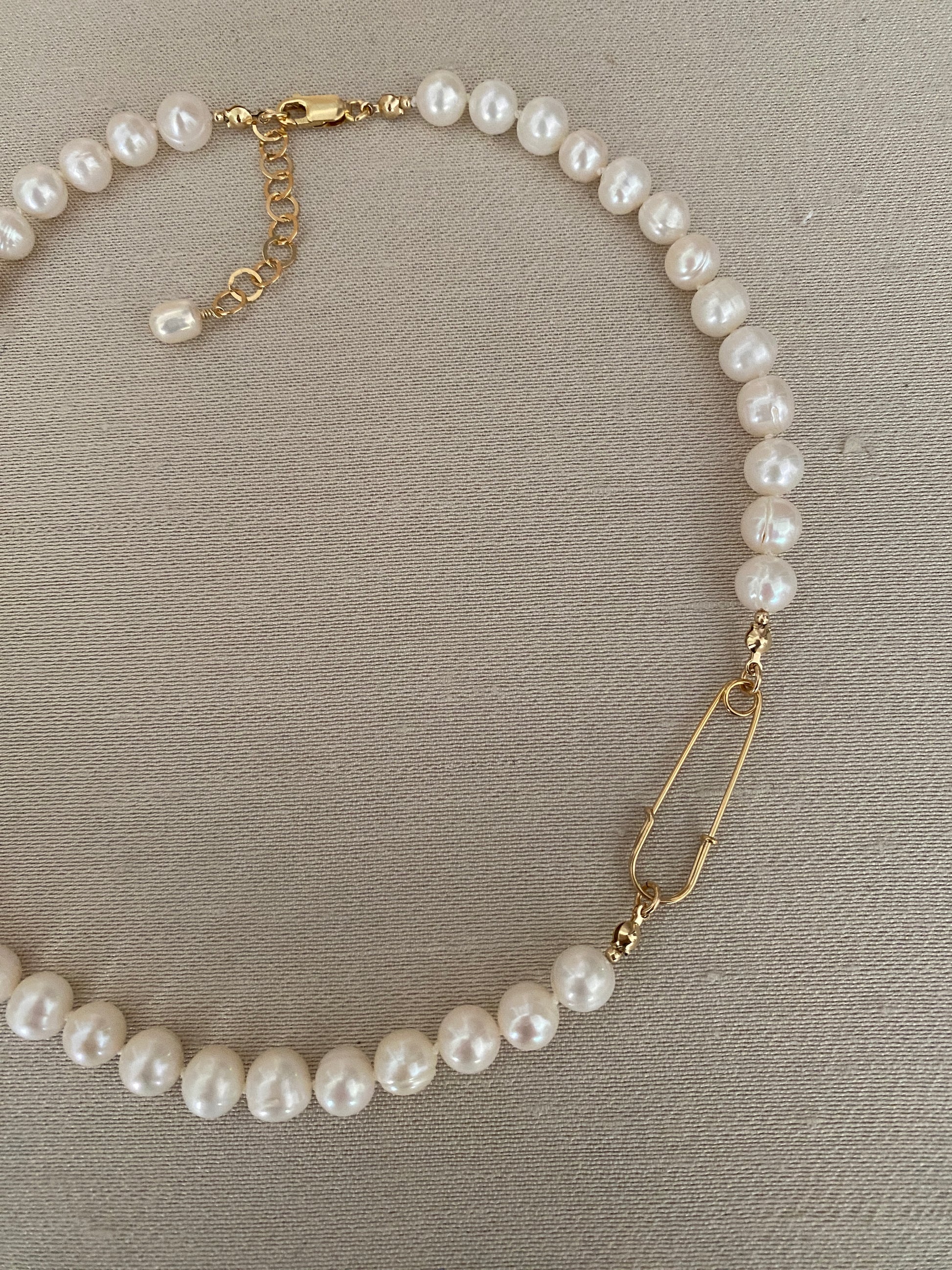 Edgy safety pin Pearl necklace with Baroque Freshwater pearls in 14KT Goldfilled.