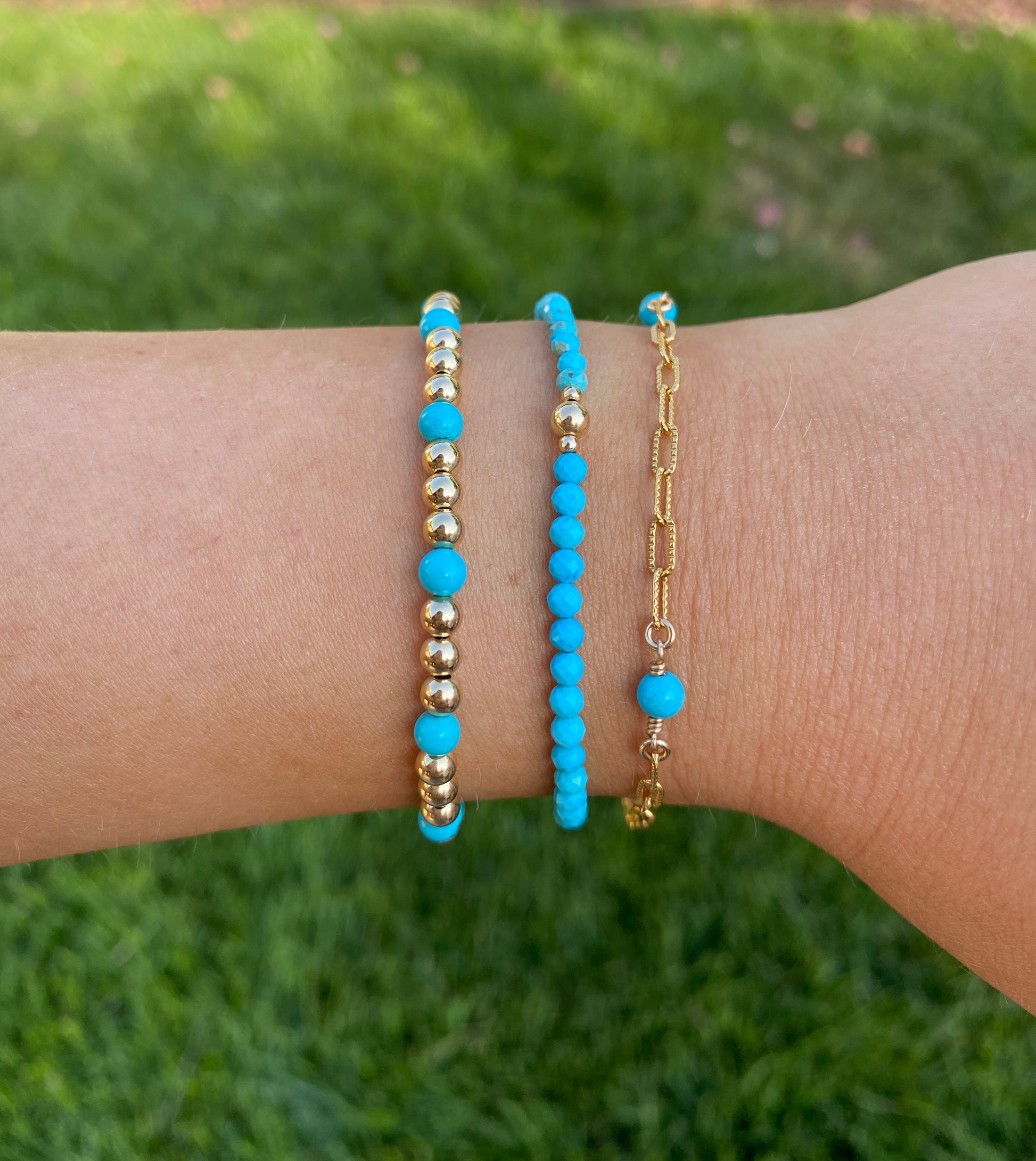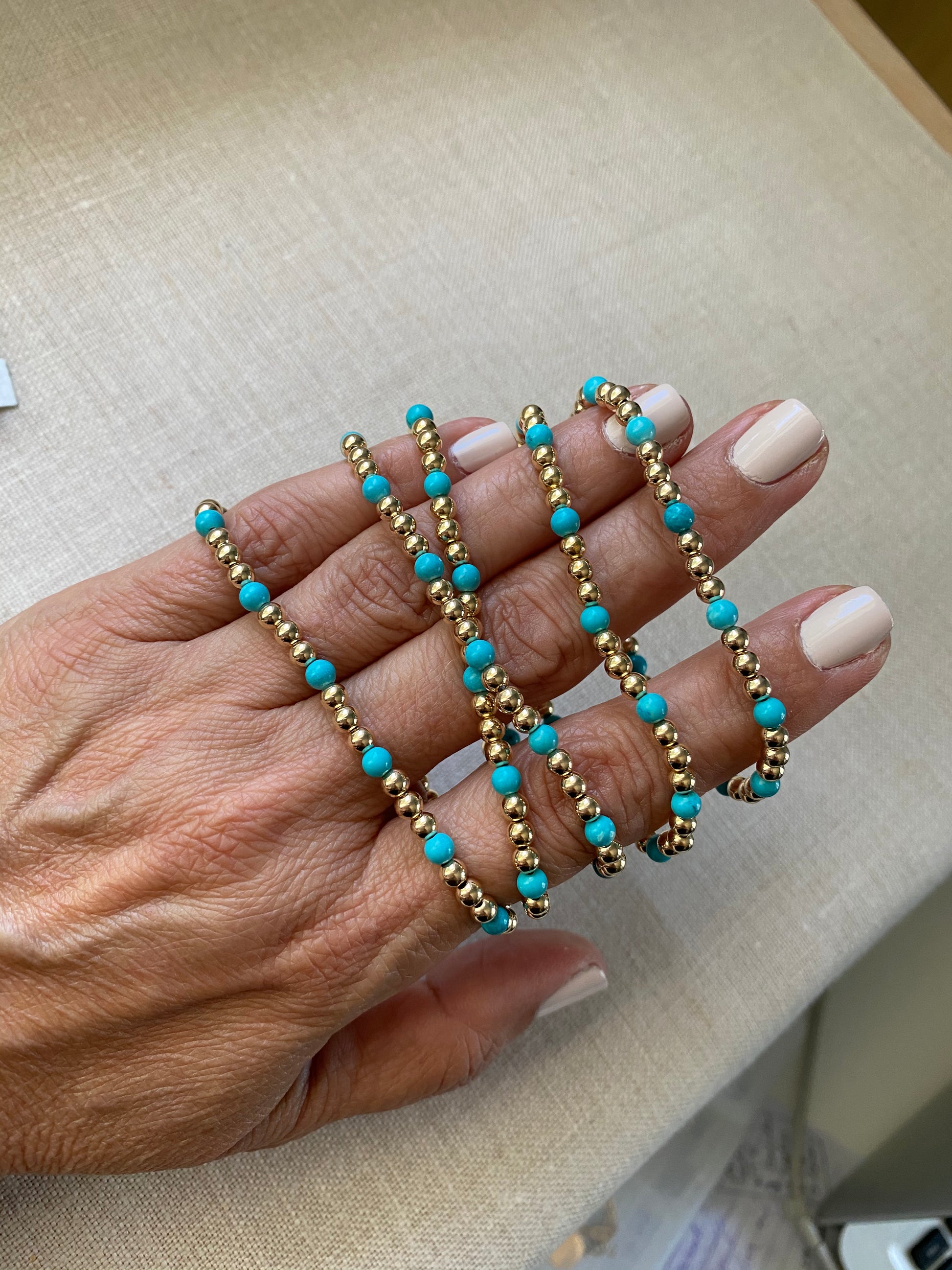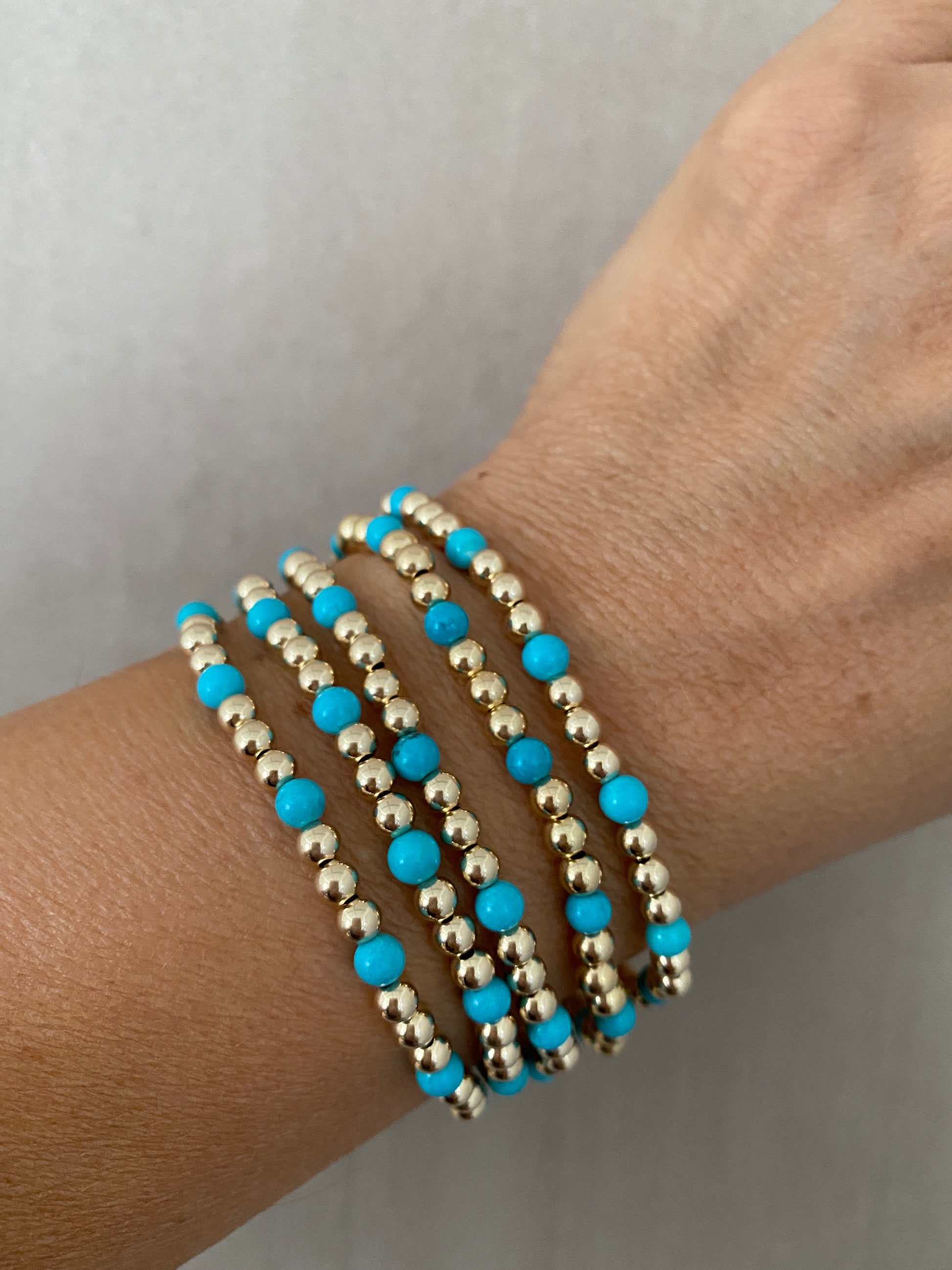 Trendy stretch bracelet made with 14KT Gold filled and Turquoise beads. Listing is for one stretch bracelet.