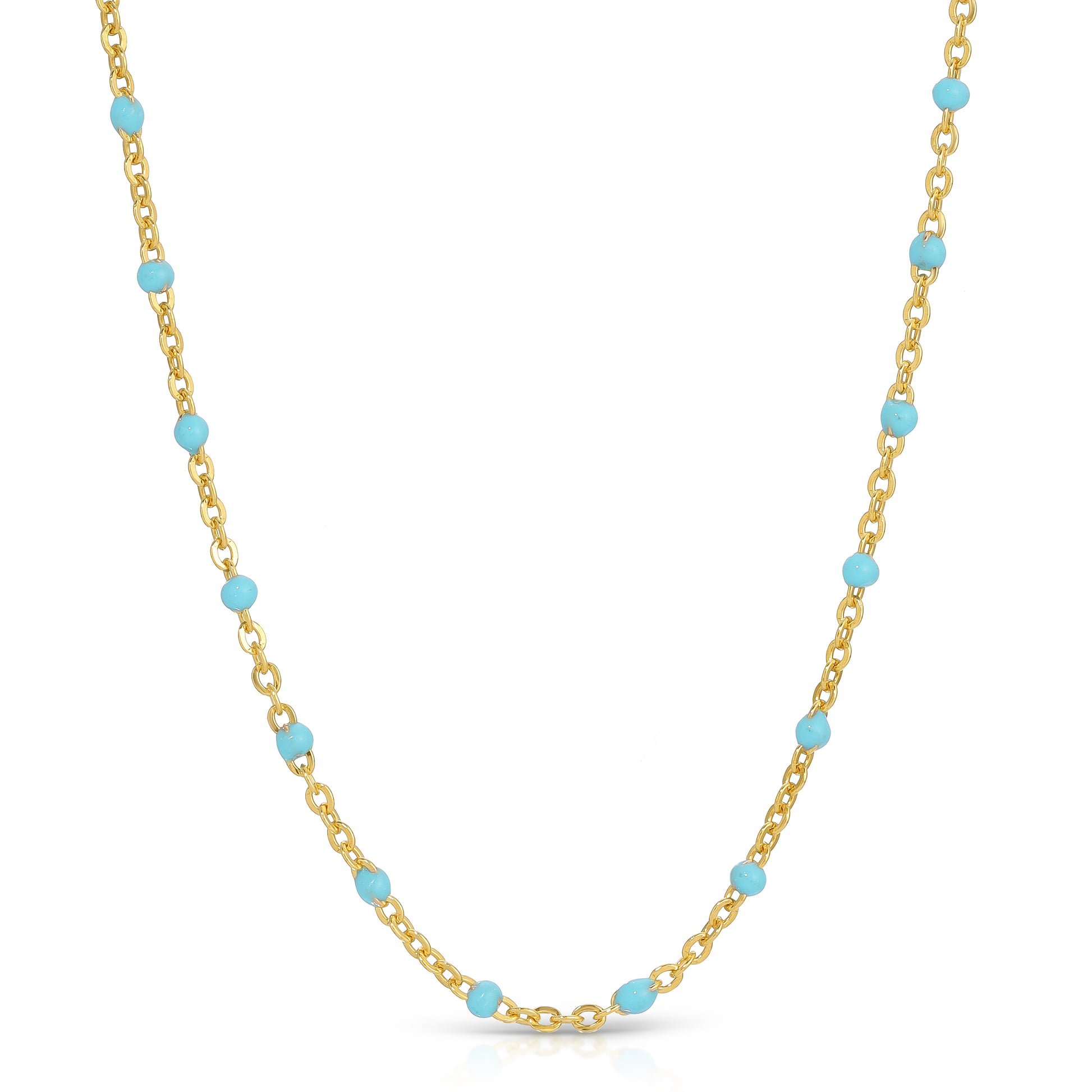 The Fiji necklace features a dainty 14KT Goldfilled chain with Turquoise enamel beads and hand-wired endings for lasting quality. Measures 17" from end to end.