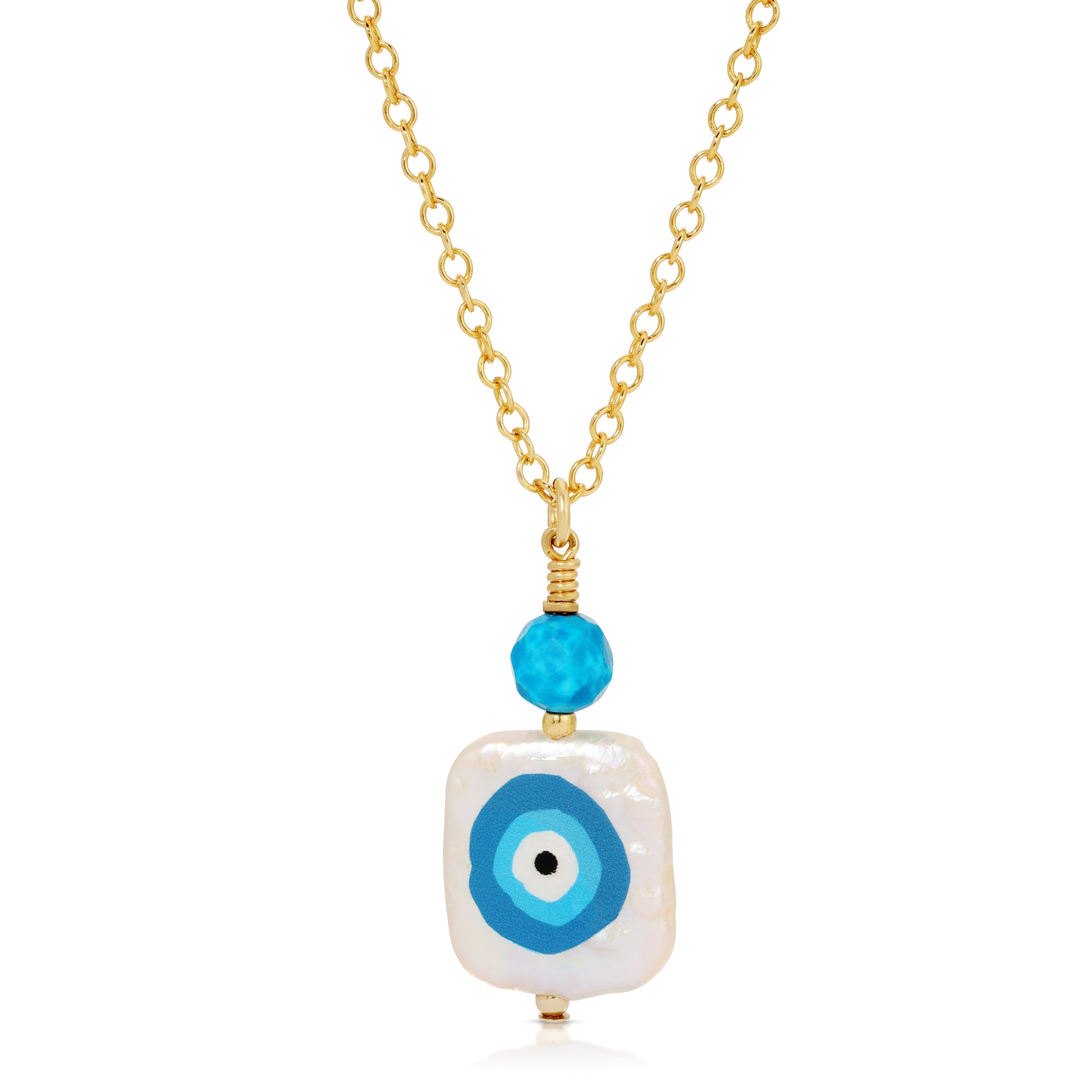 The Fortuna necklace bears an evil eye on pearl charm, finished with a blue faceted bead and 14KT Gold filled chain and clasp. Measures 16" plus 2" extension.