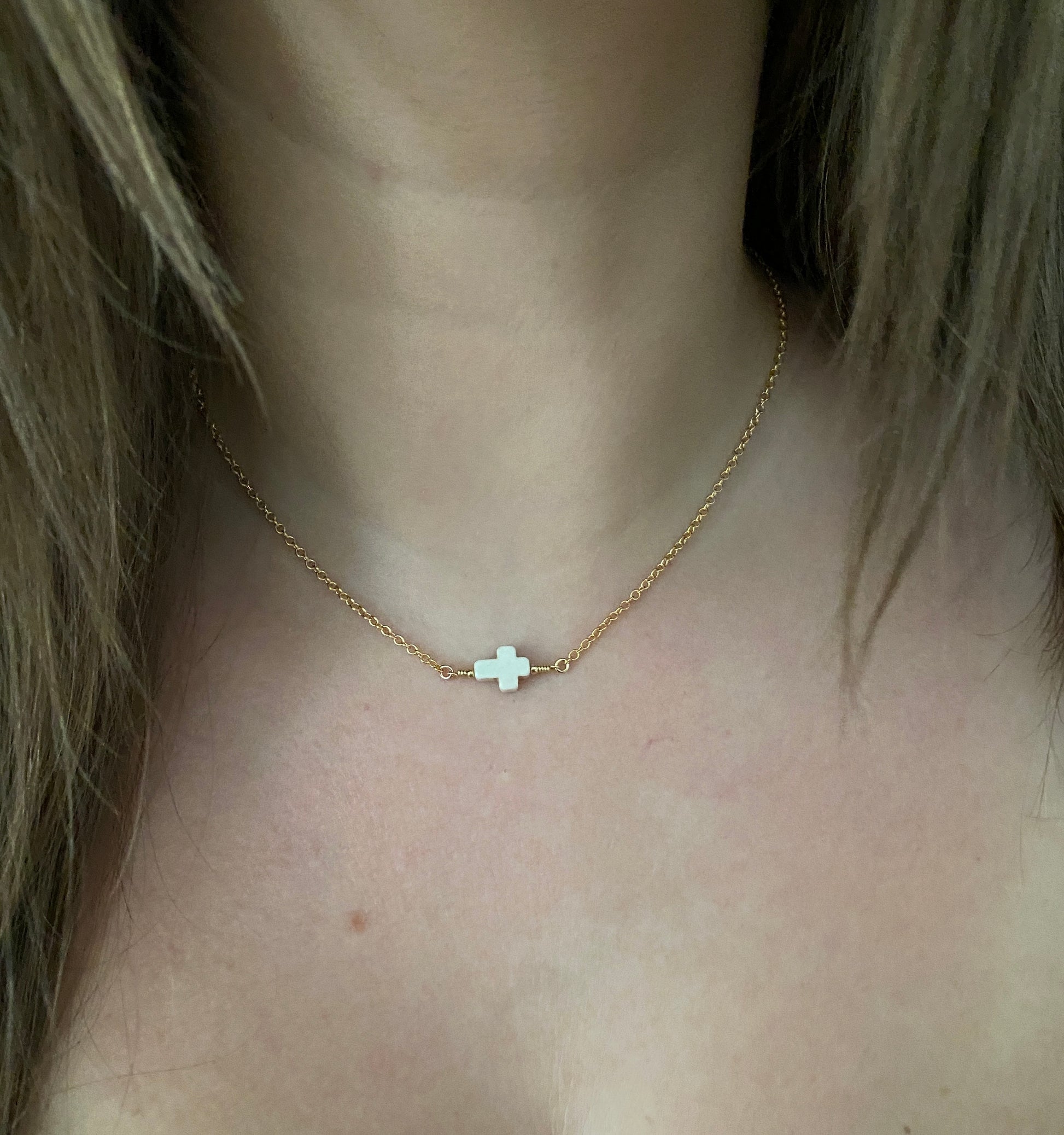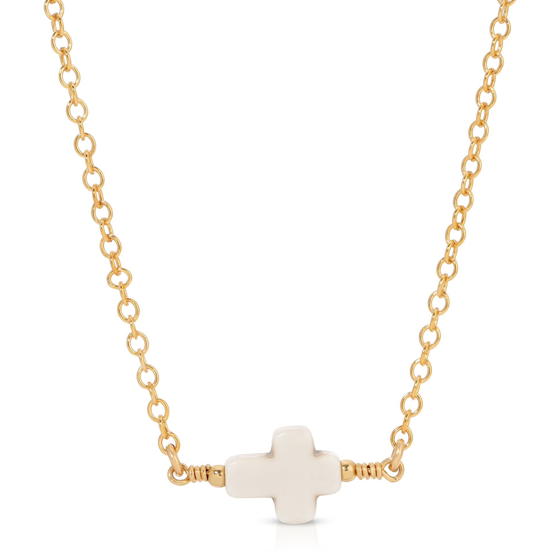 The Geovanna Cross necklace features a hand-wired cream cross on a 14KT gold-filled chain completed with a lobster clasp. It measures 16" plus a 1" extension.