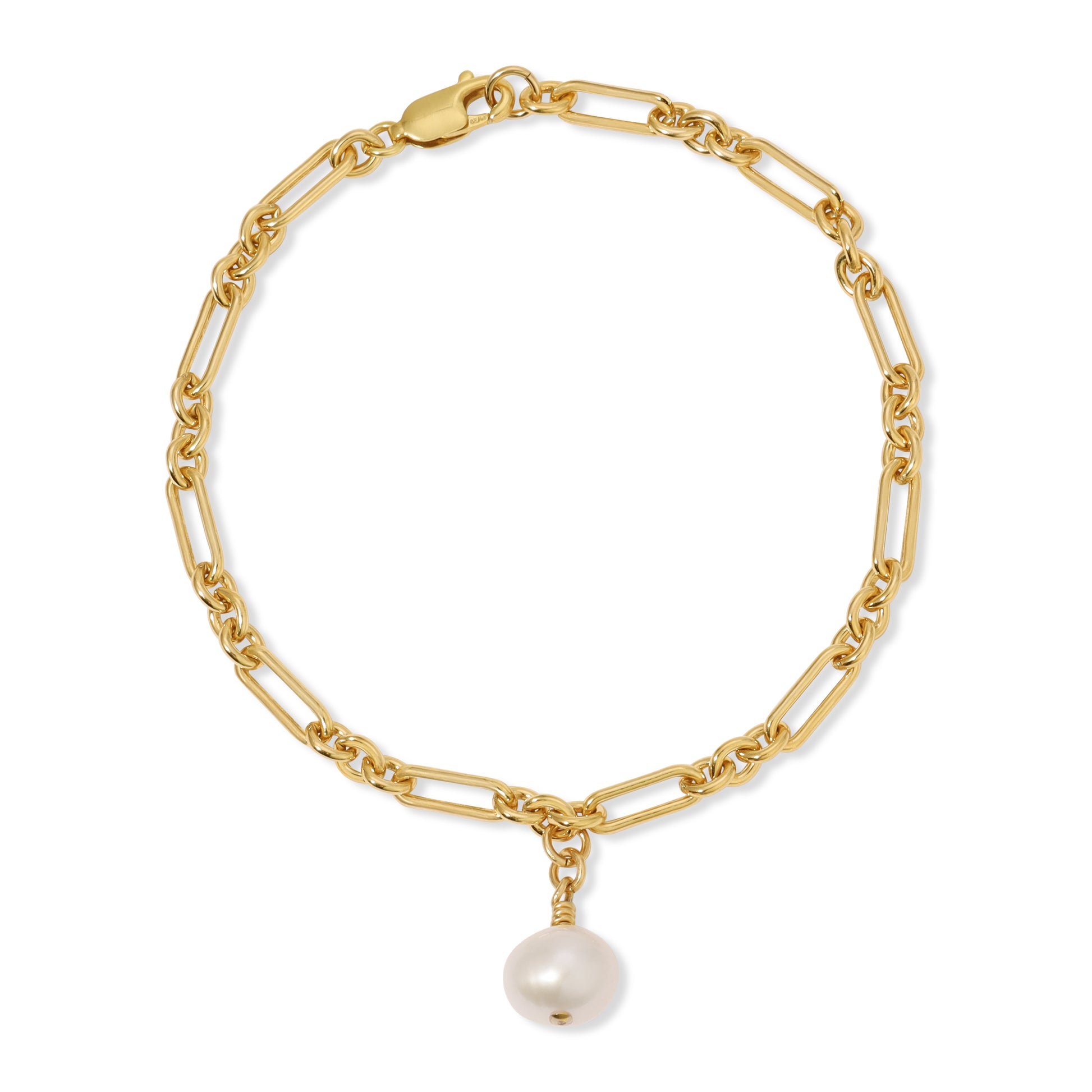 Celeste 14KT Gold filled link chain bracelet with a freshwater pearl charm. Measures 7.5".