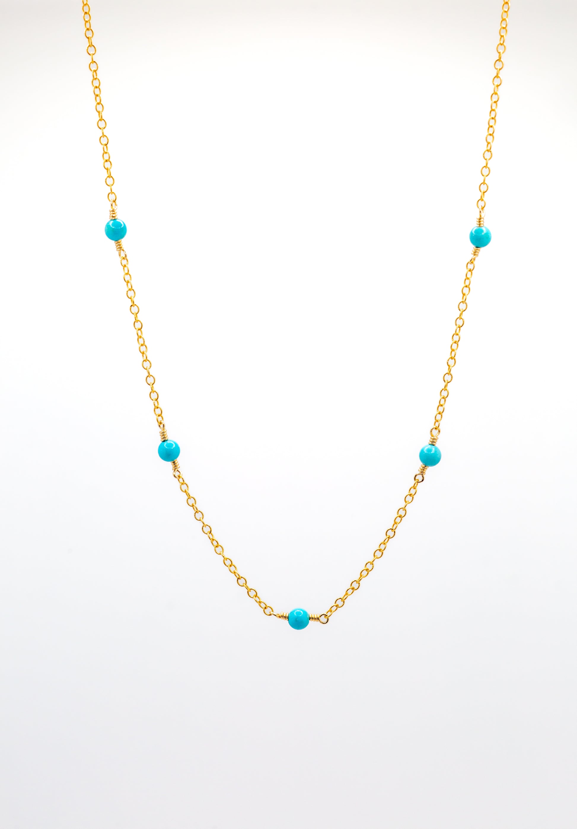 The beautiful Isabella necklace features five Turquoise beads hand wired into a 14KT Gold filled chain and clasp. Measures 16" plus 1" extension.