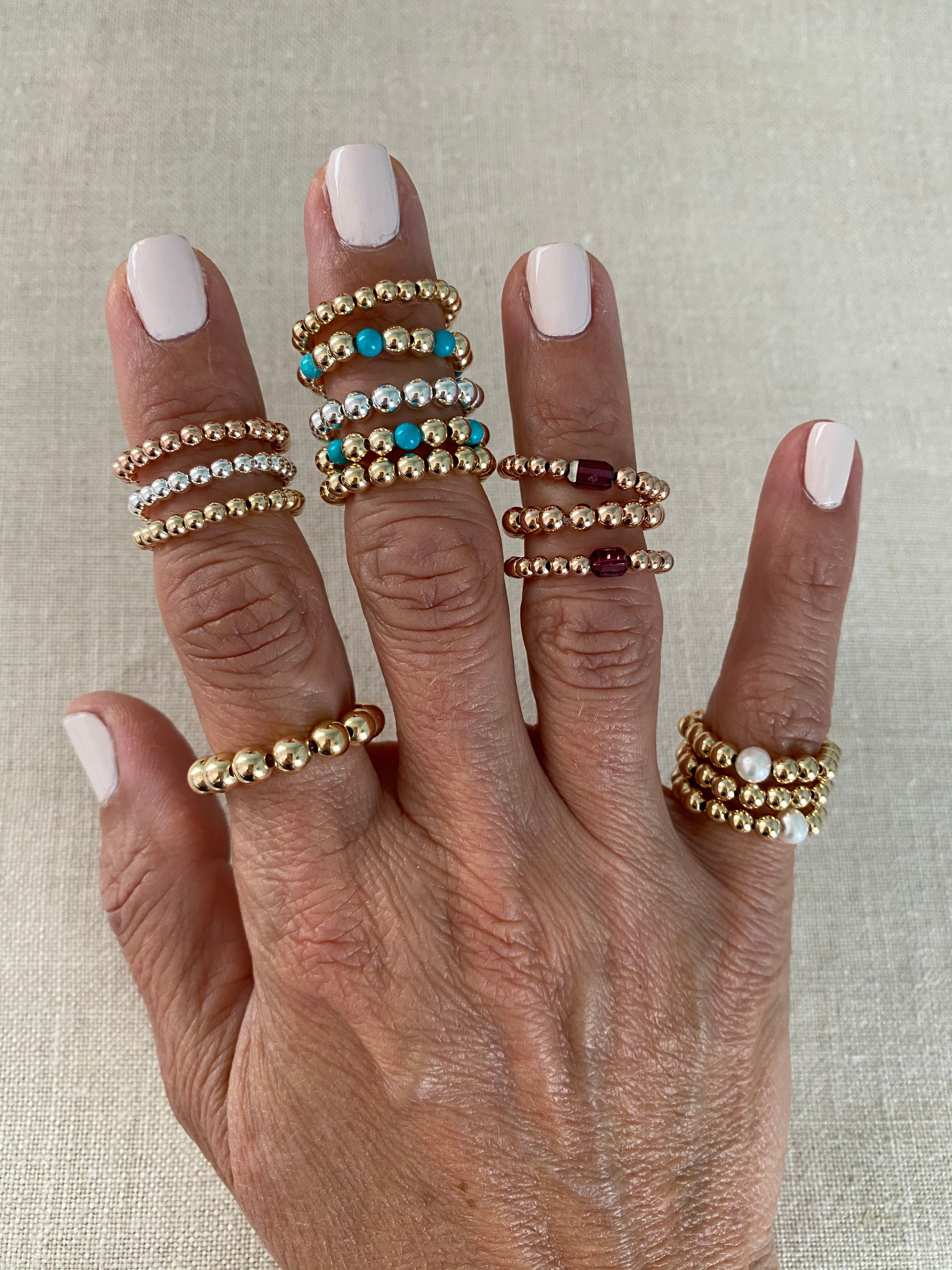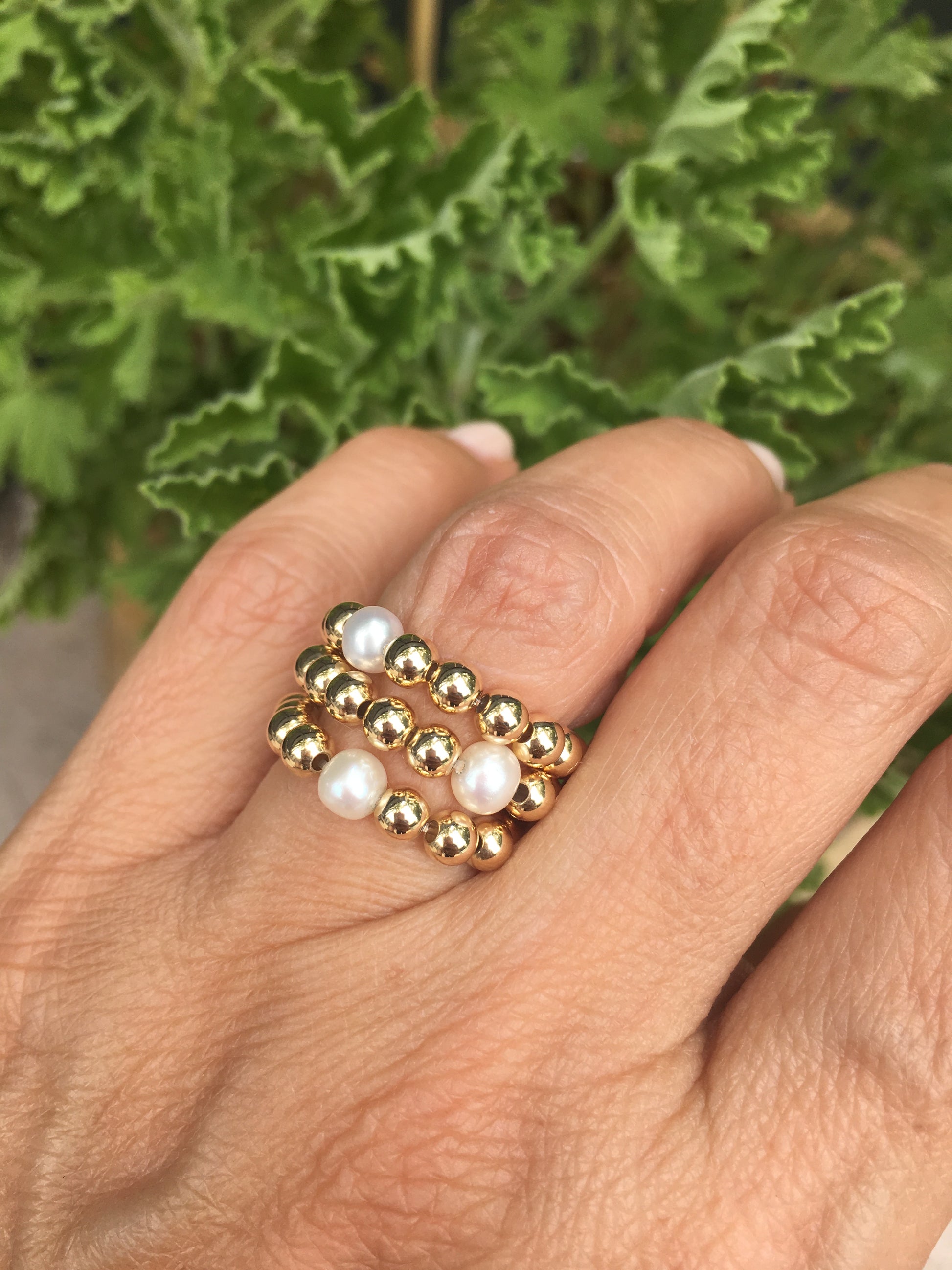 Gold filled beads and a Freshwater pearl on a stretchy band. Comes in three sizes to choose from. This listing is for one ring.