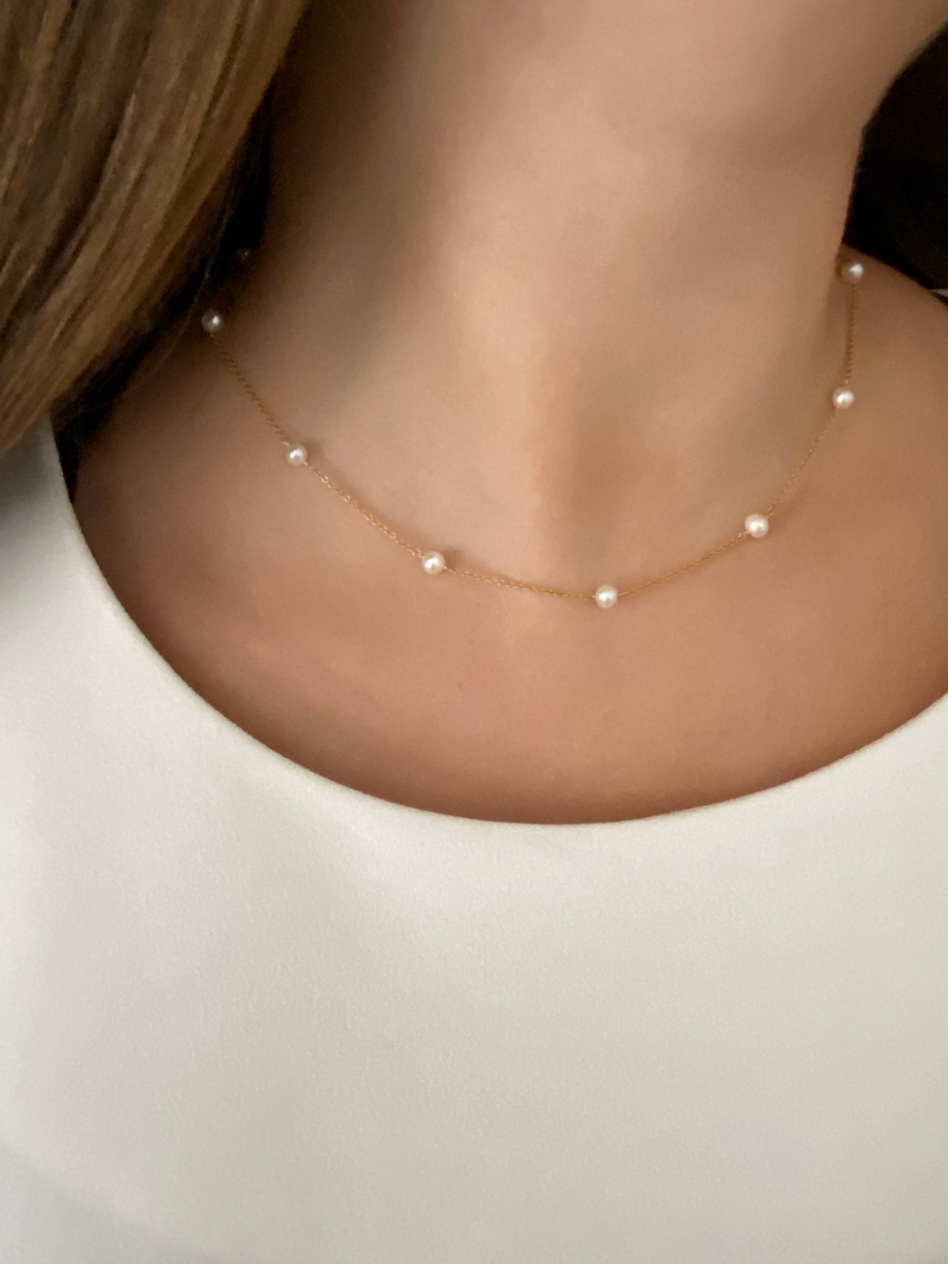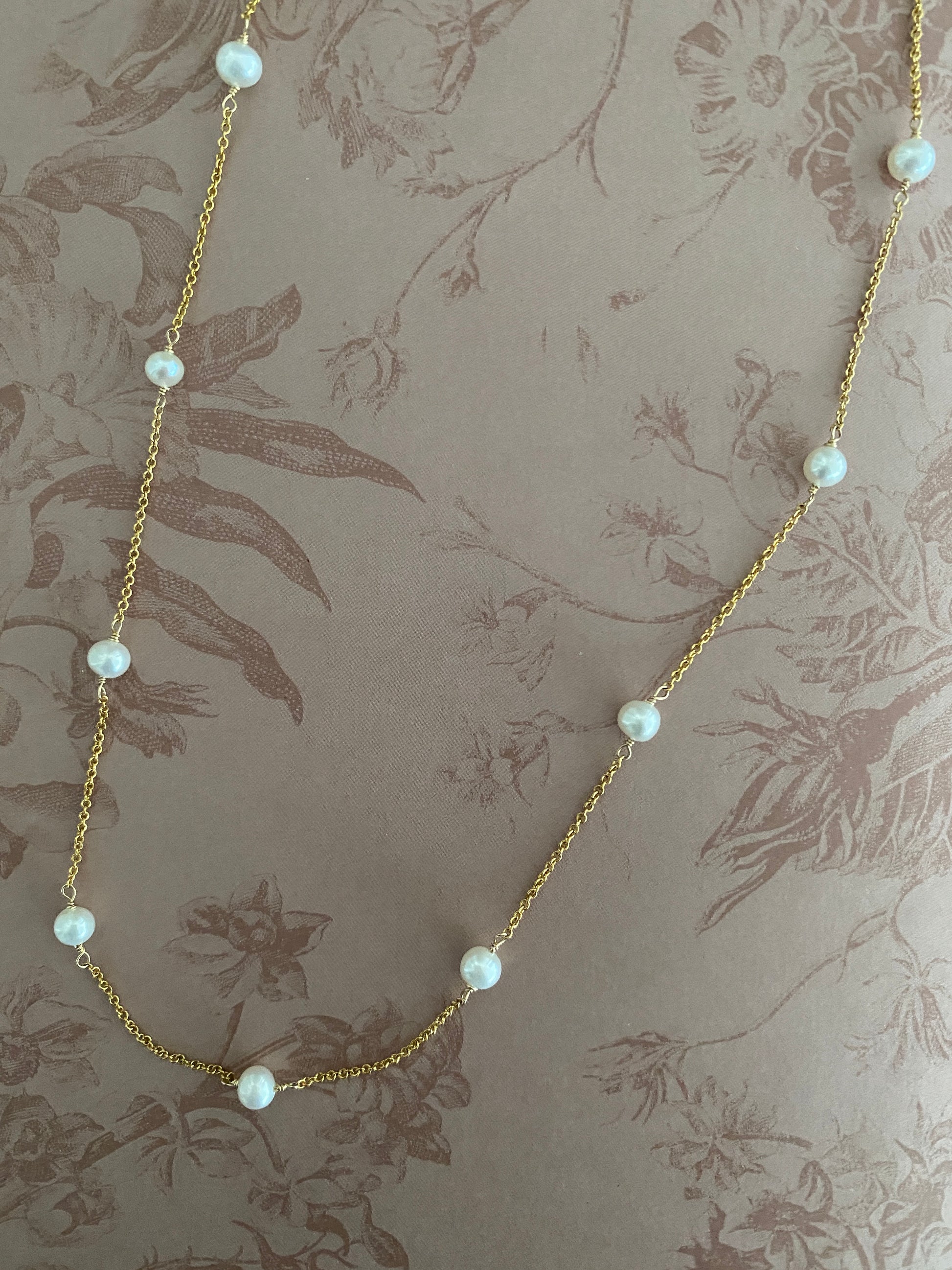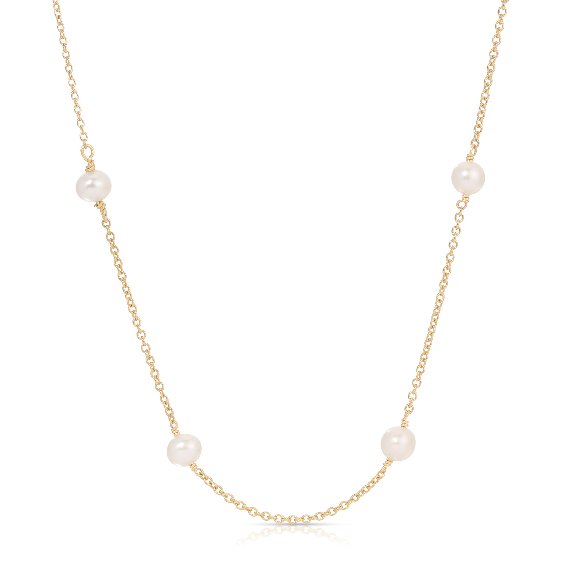 This versatile pearl necklace features 12 freshwater pearls hand-wired into a 14KT Gold filled chain with lobster clasp closure. Measures 17” from end to end.