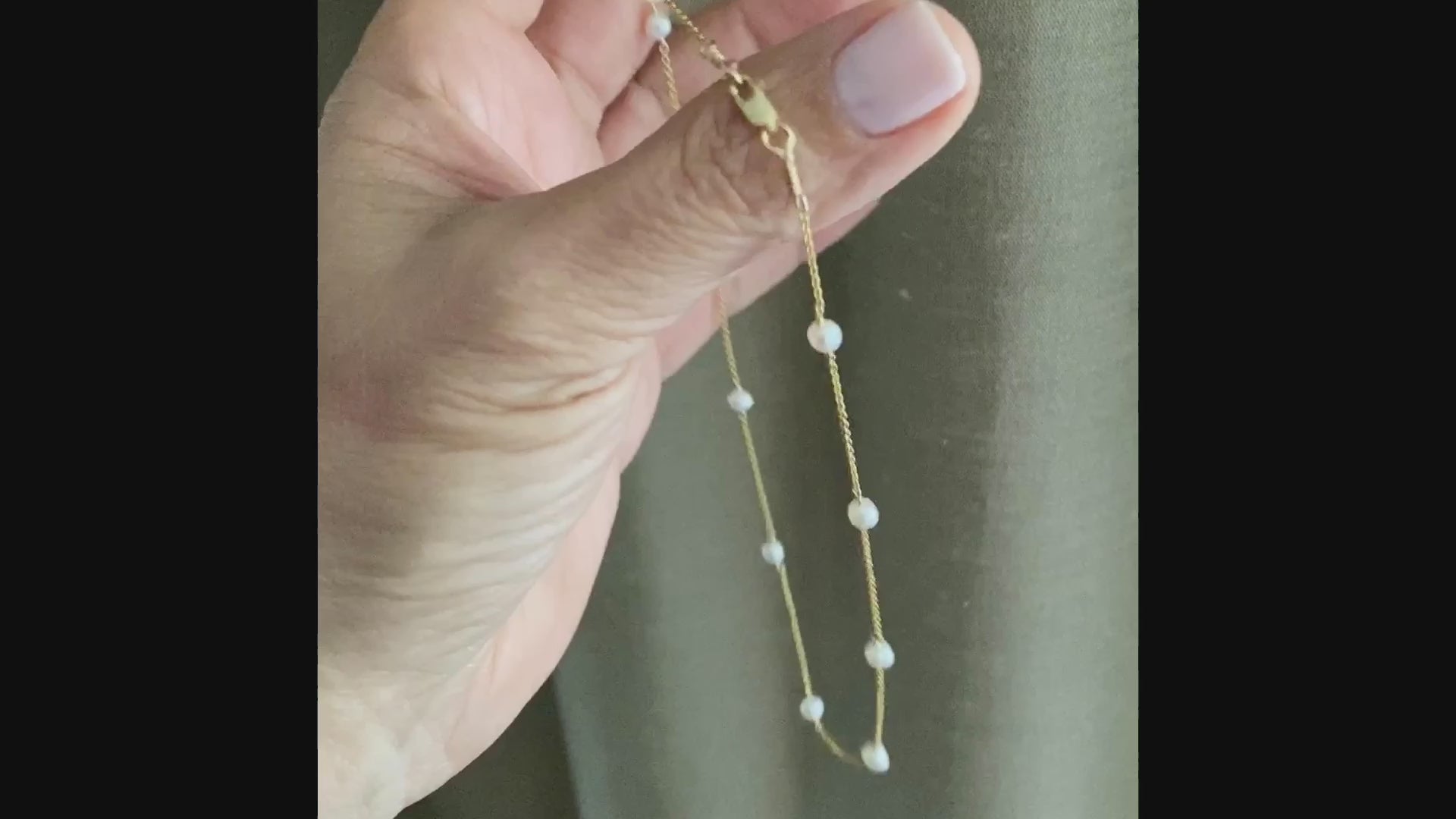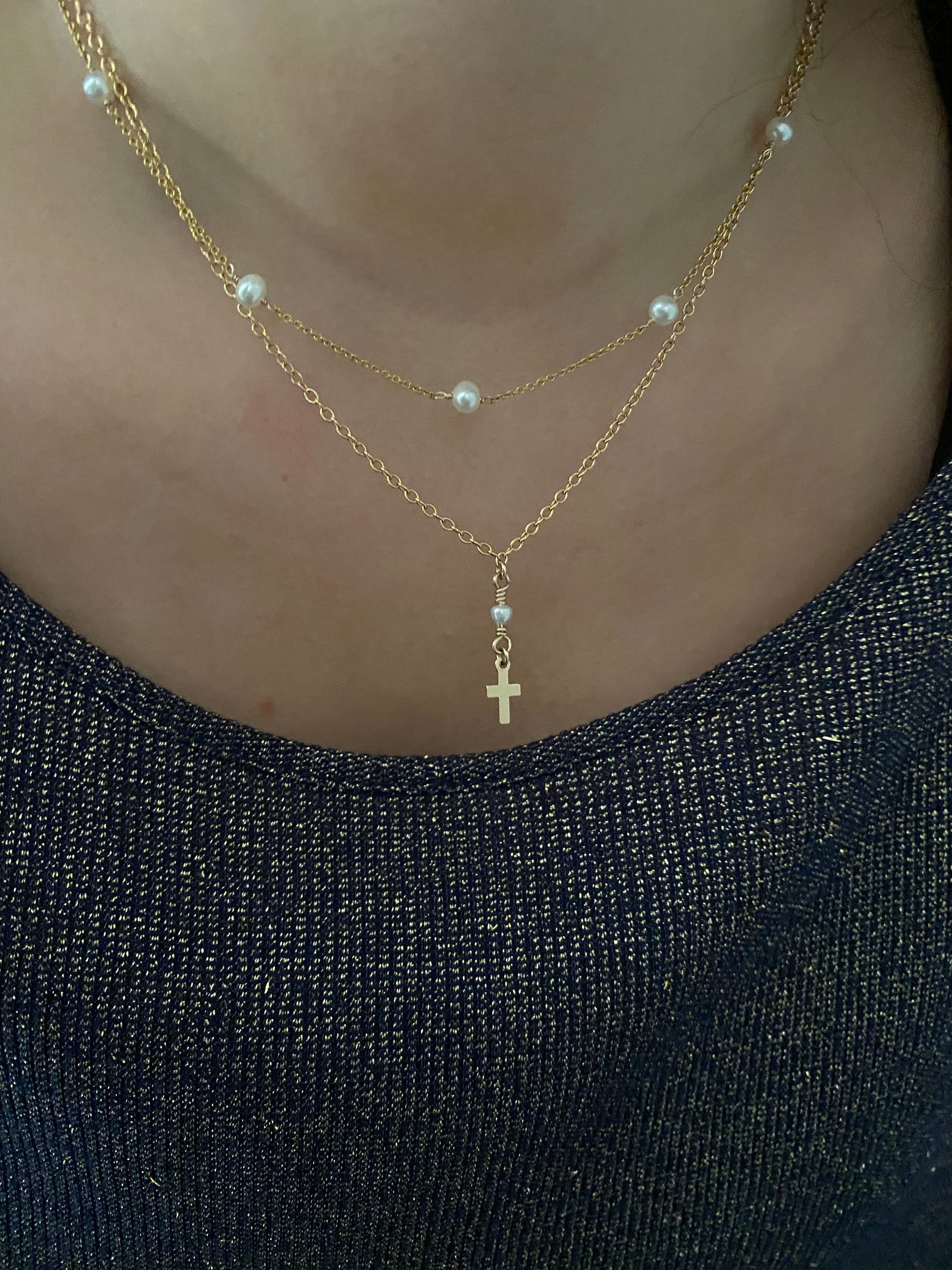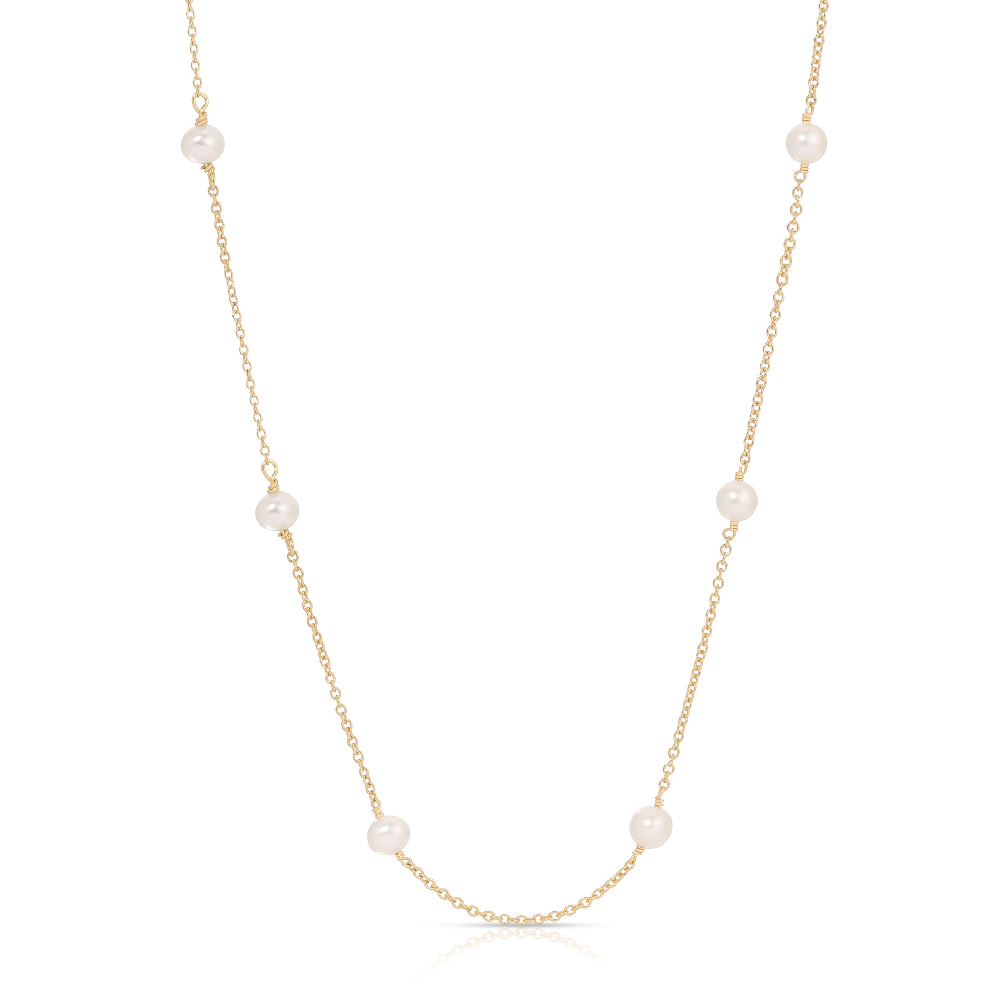 This versatile pearl necklace features 12 freshwater pearls hand-wired into a 14KT Gold filled chain with lobster clasp closure. Measures 17” from end to end.