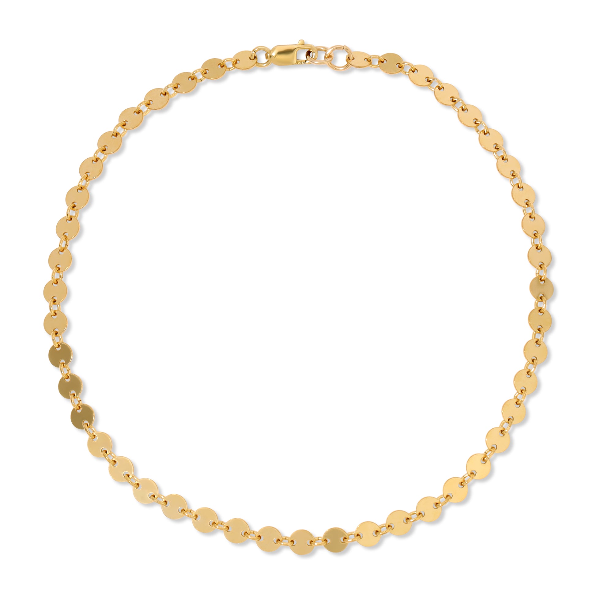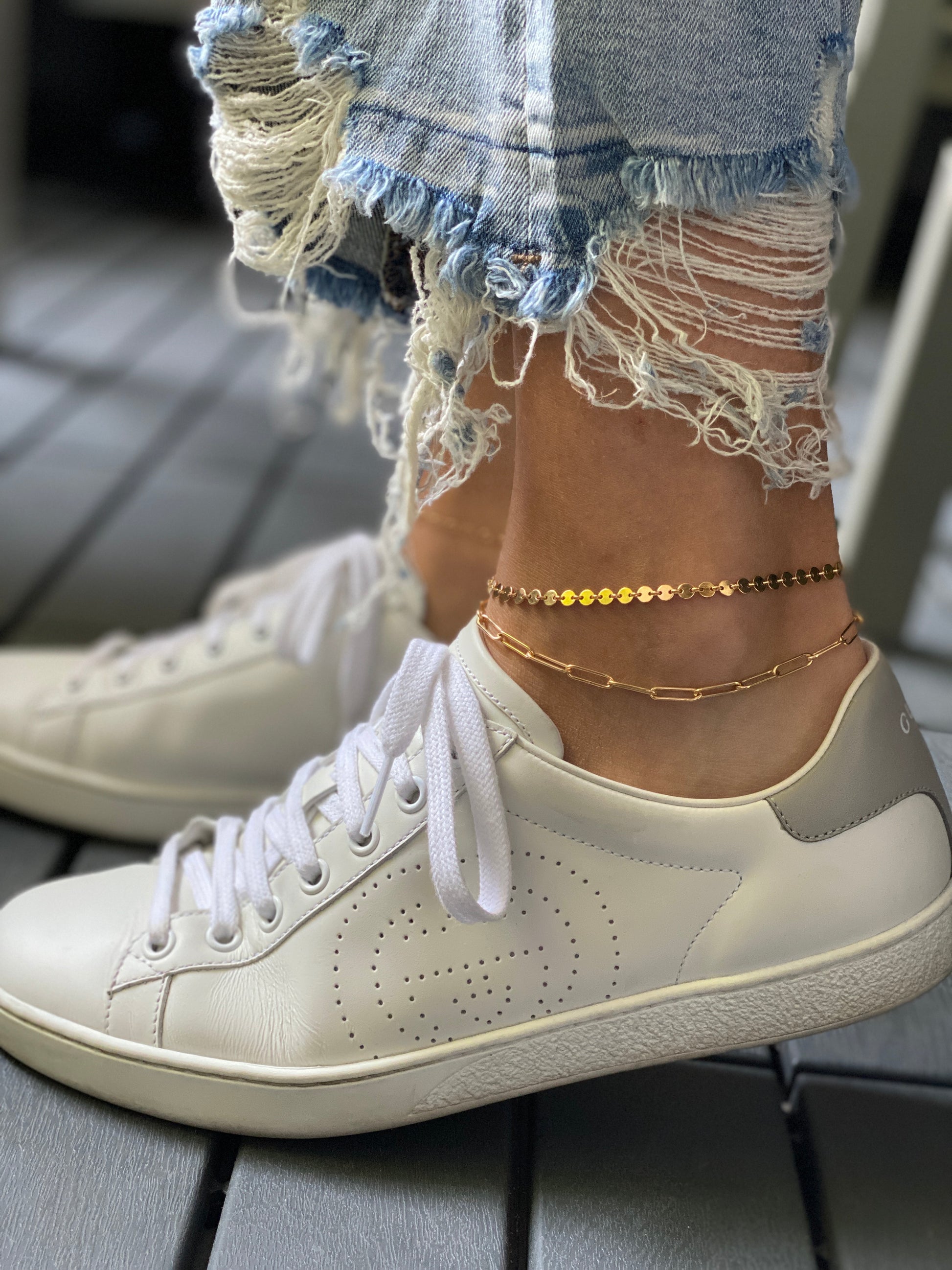 The Mila disc chain anklet is made of 4mm gold discs and catch the light with movement. It is made entirely of 14KT Gold filled. Meaures 10 ¼" long.