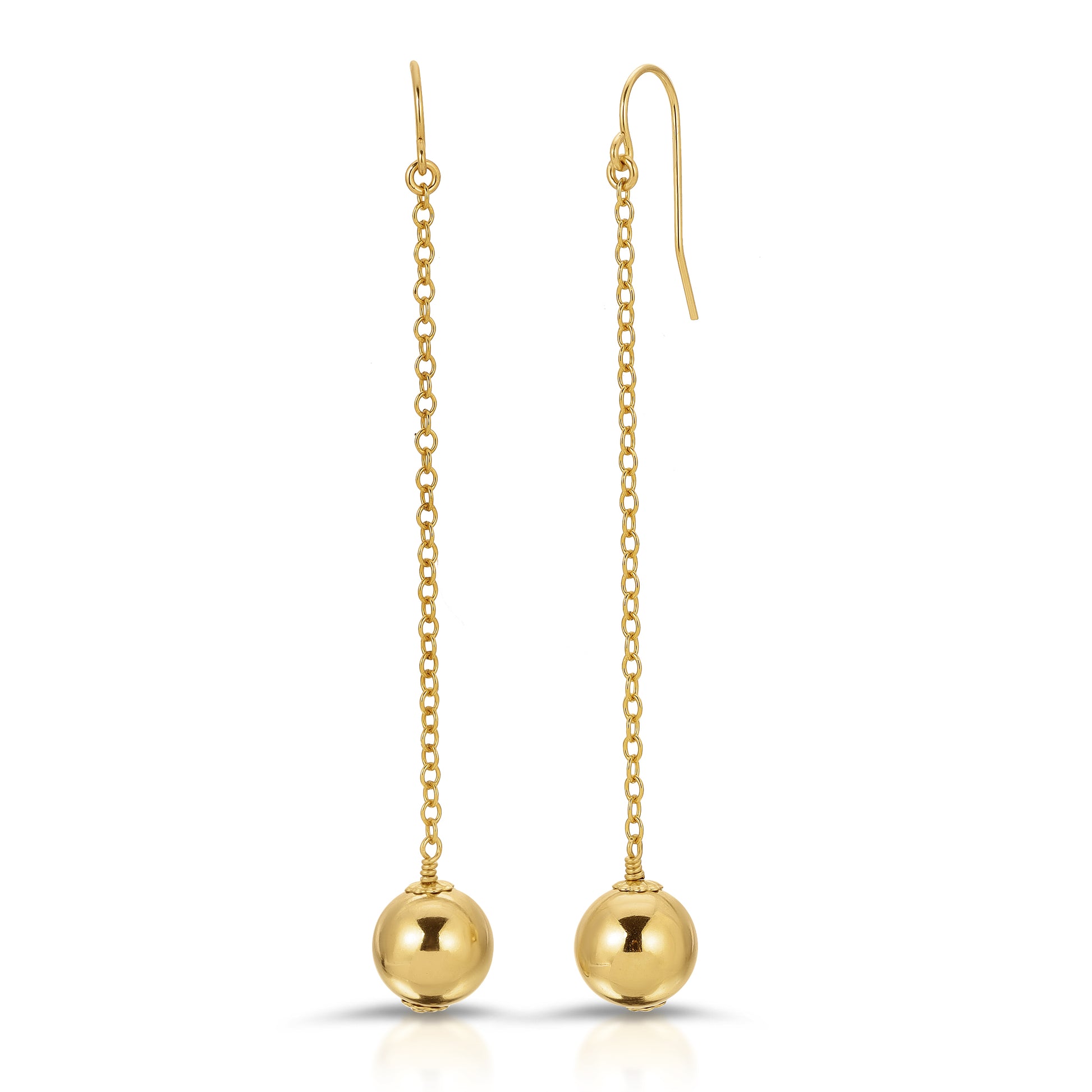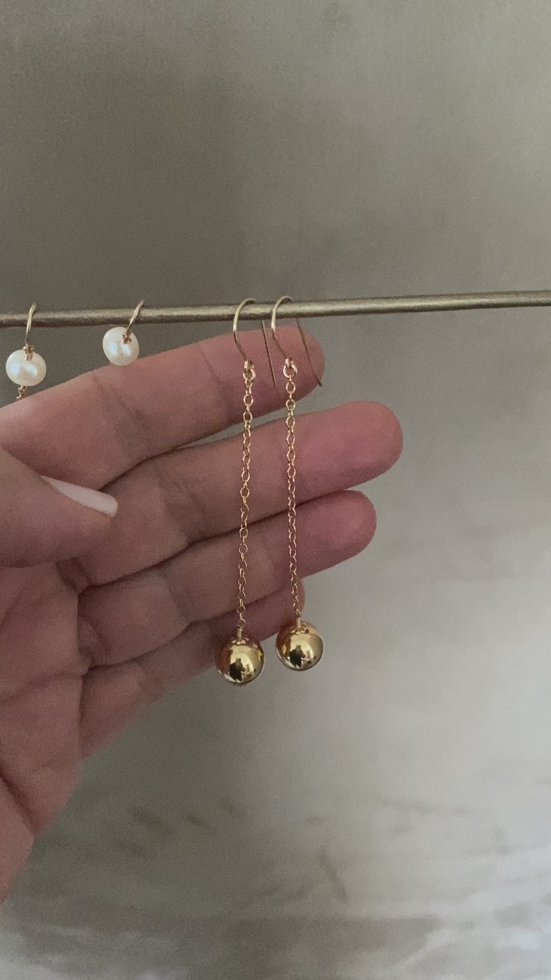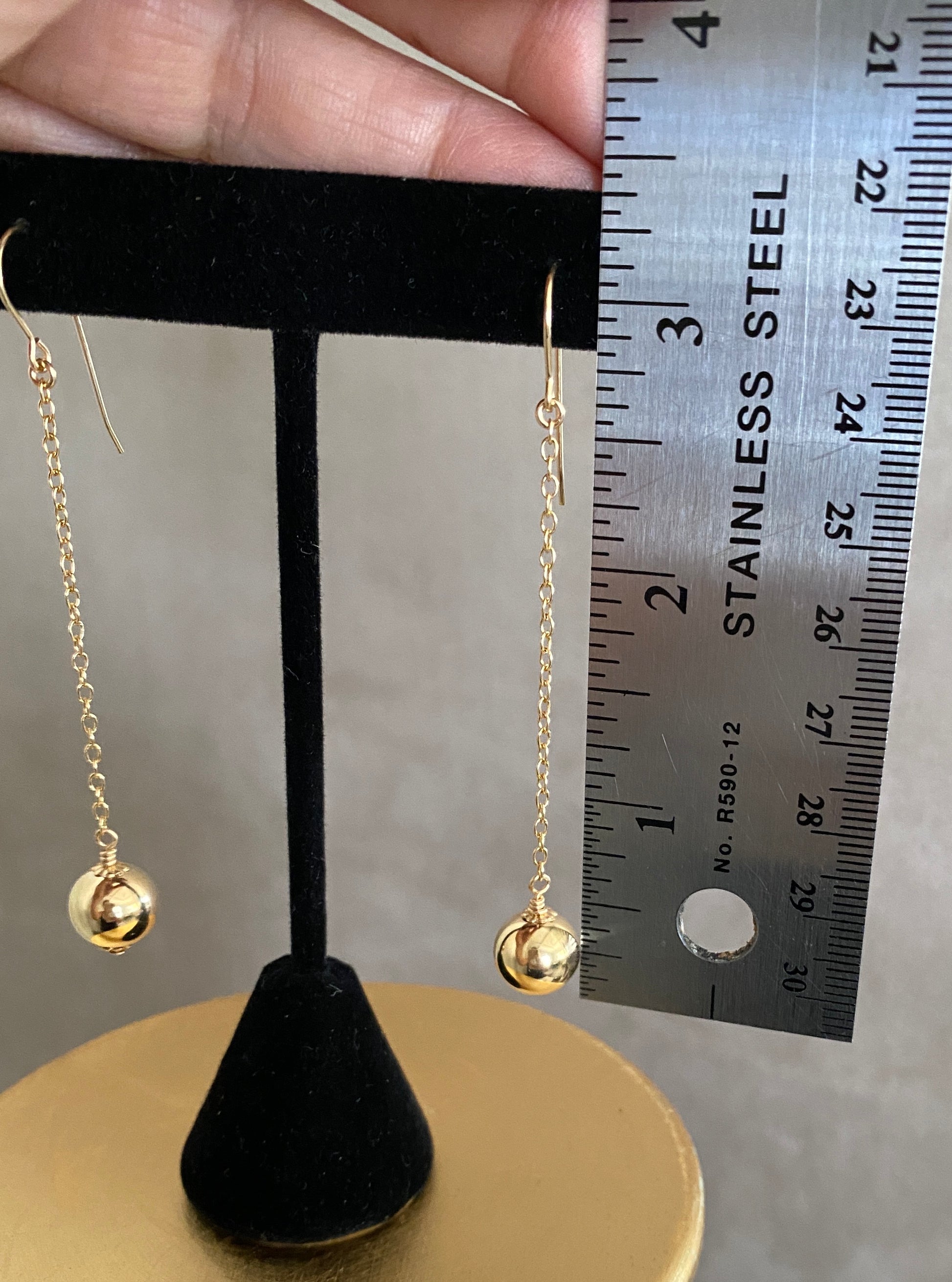 These sophisticated dangle earrings feature 10mm Balls hand-wired in 14KT Gold Filled. Measuring 3” in length from top to bottom, they make a stunning statement.