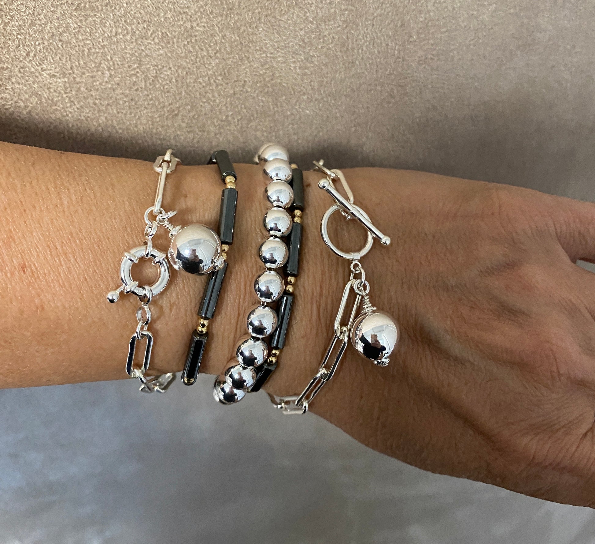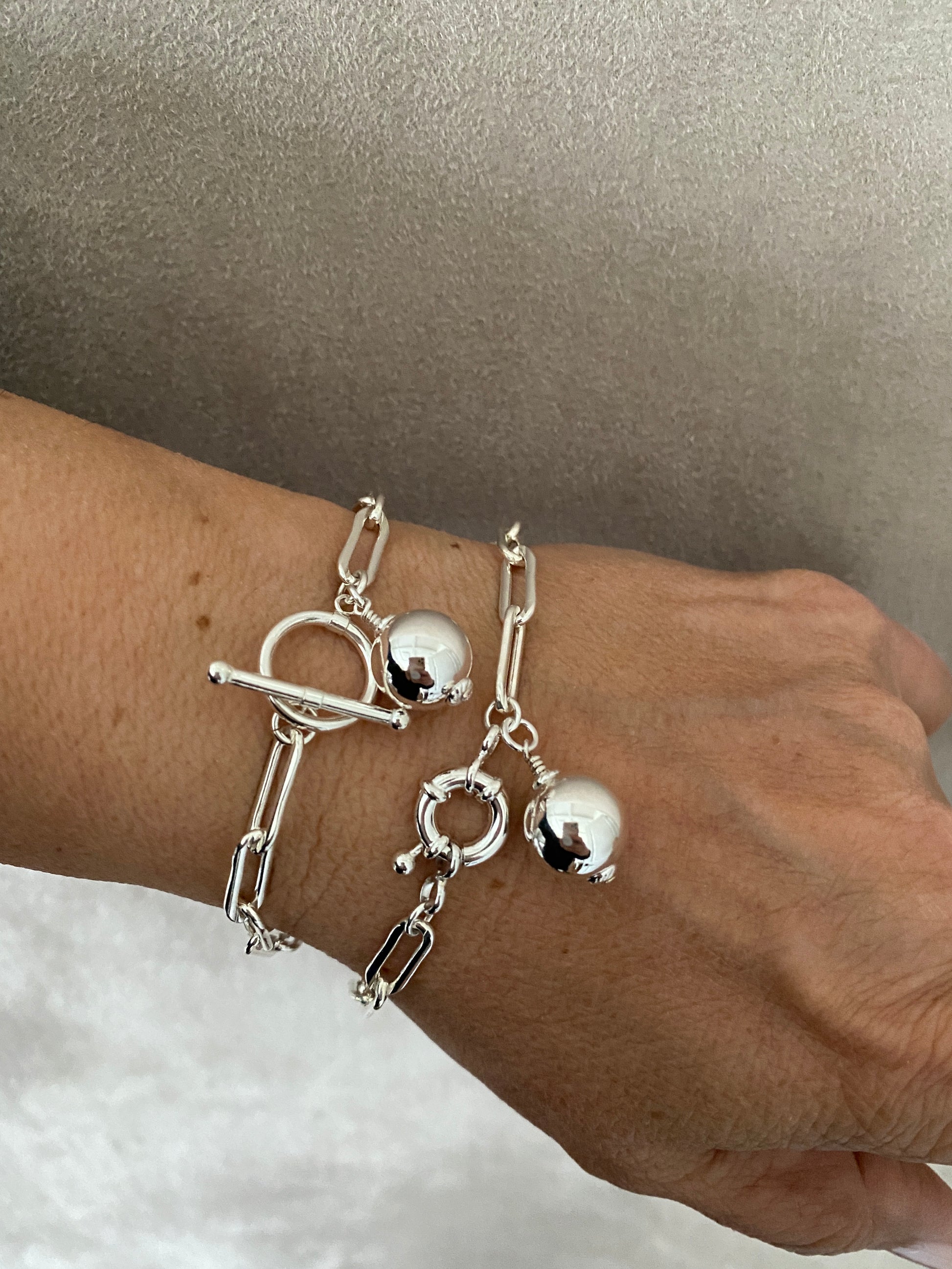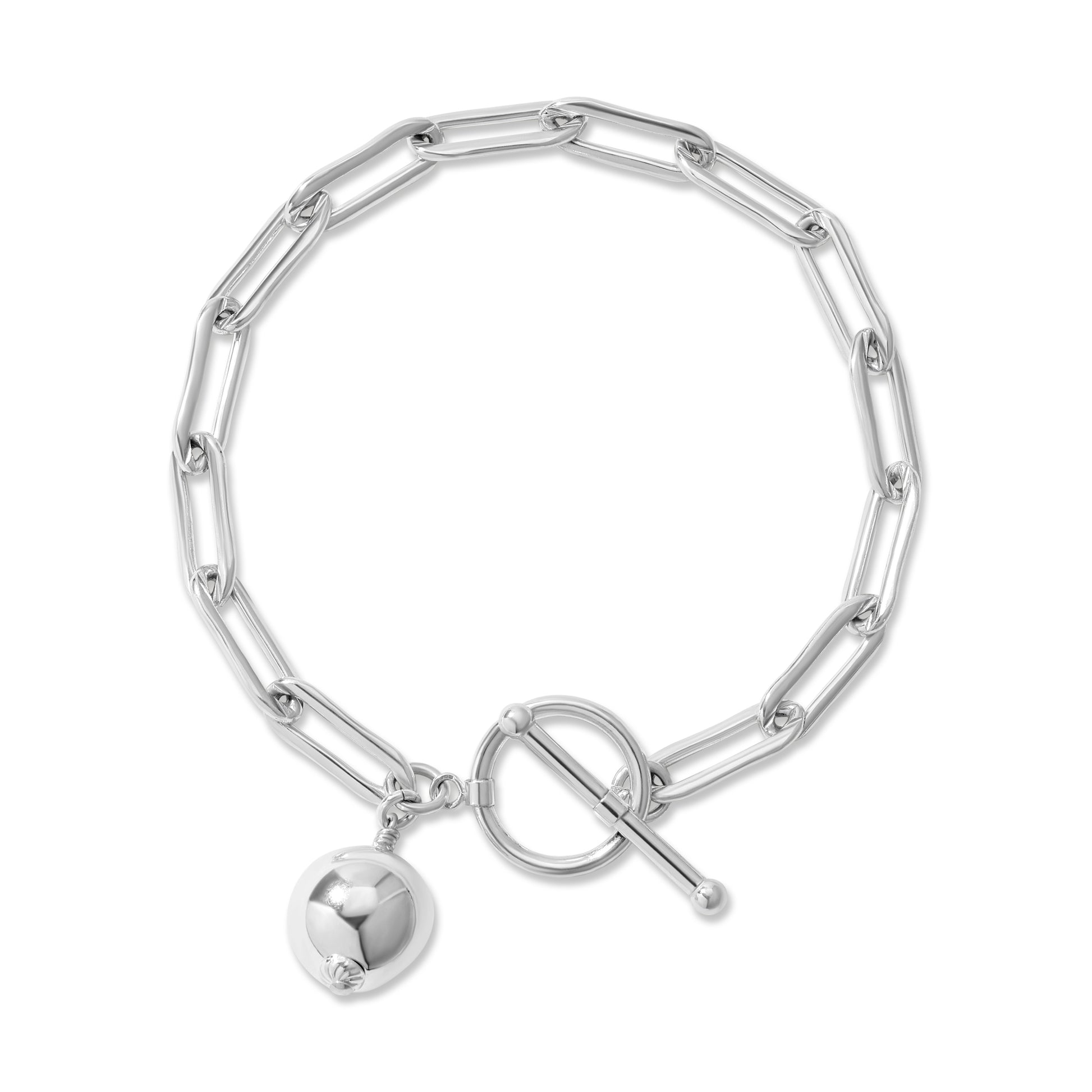 This Paperclip link bracelet in Sterling silver with a 12mm sterling silver ball charm and a toggle clasp. Measures 7.5”.