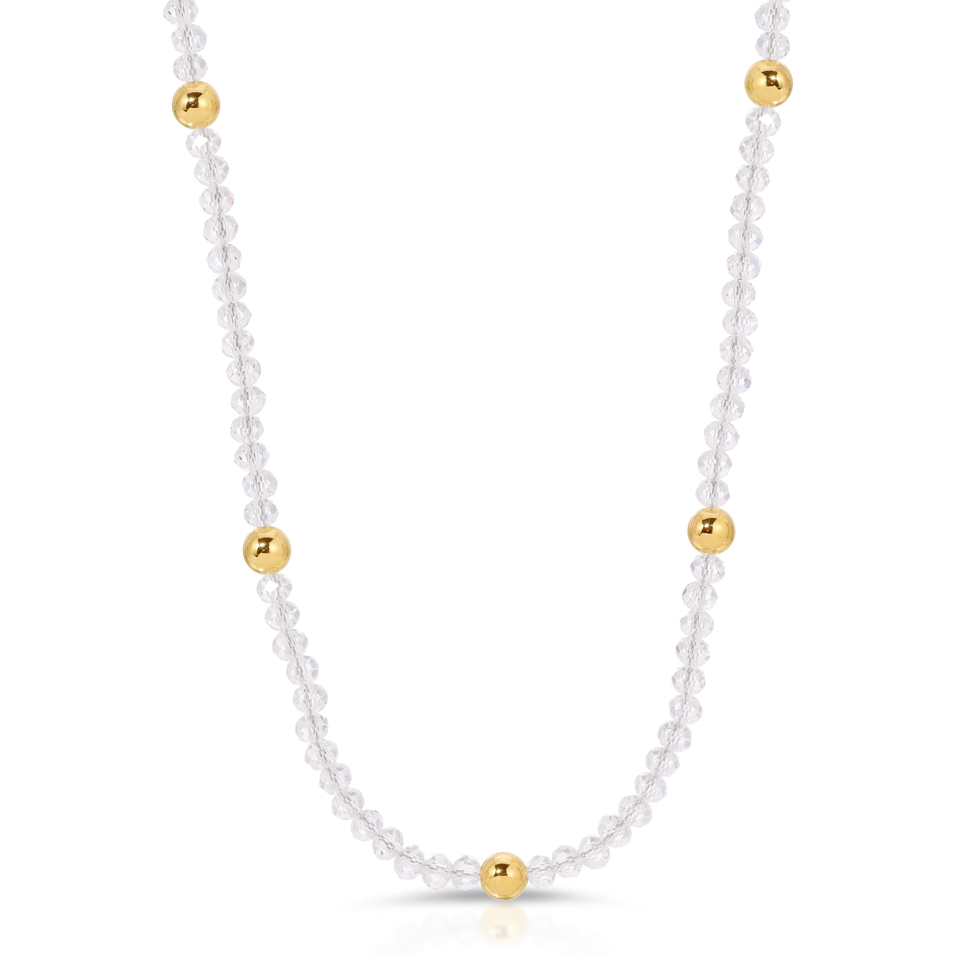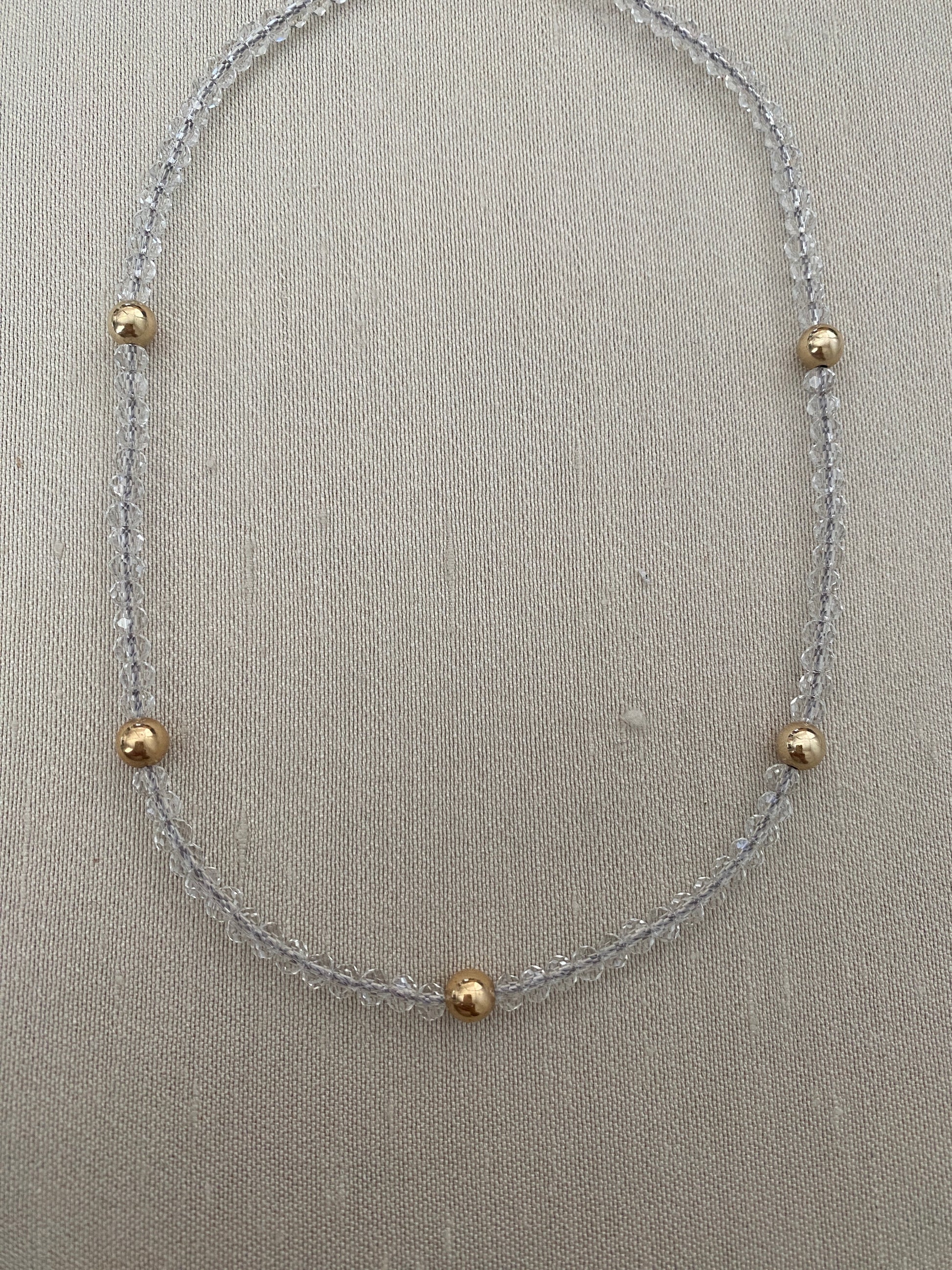 The Alba necklace is hand strung on silk cord with clear 4mm crystal rondelles studded with 6mm gold beads. All gold components are 14KT Goldfilled. Measures 15"-17".