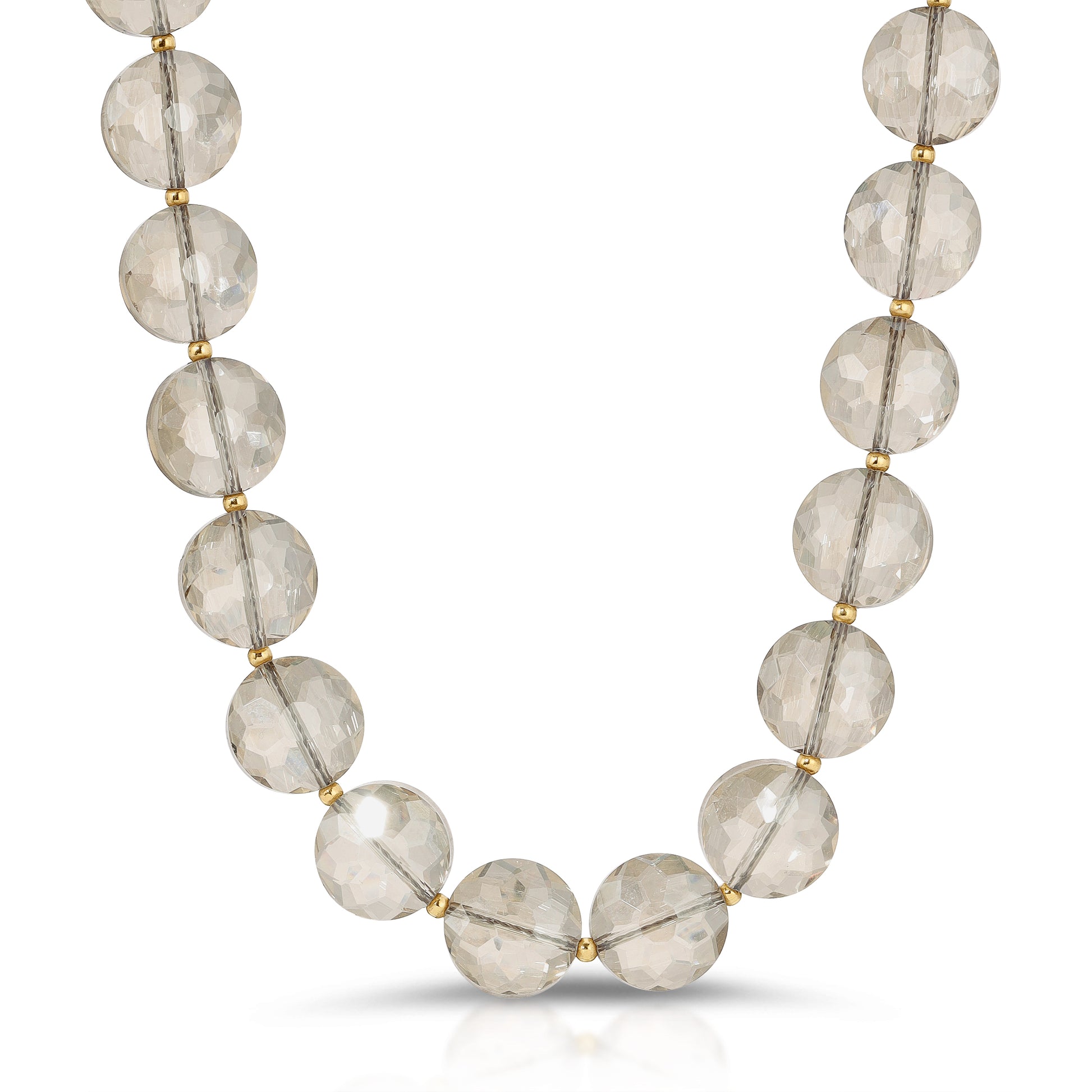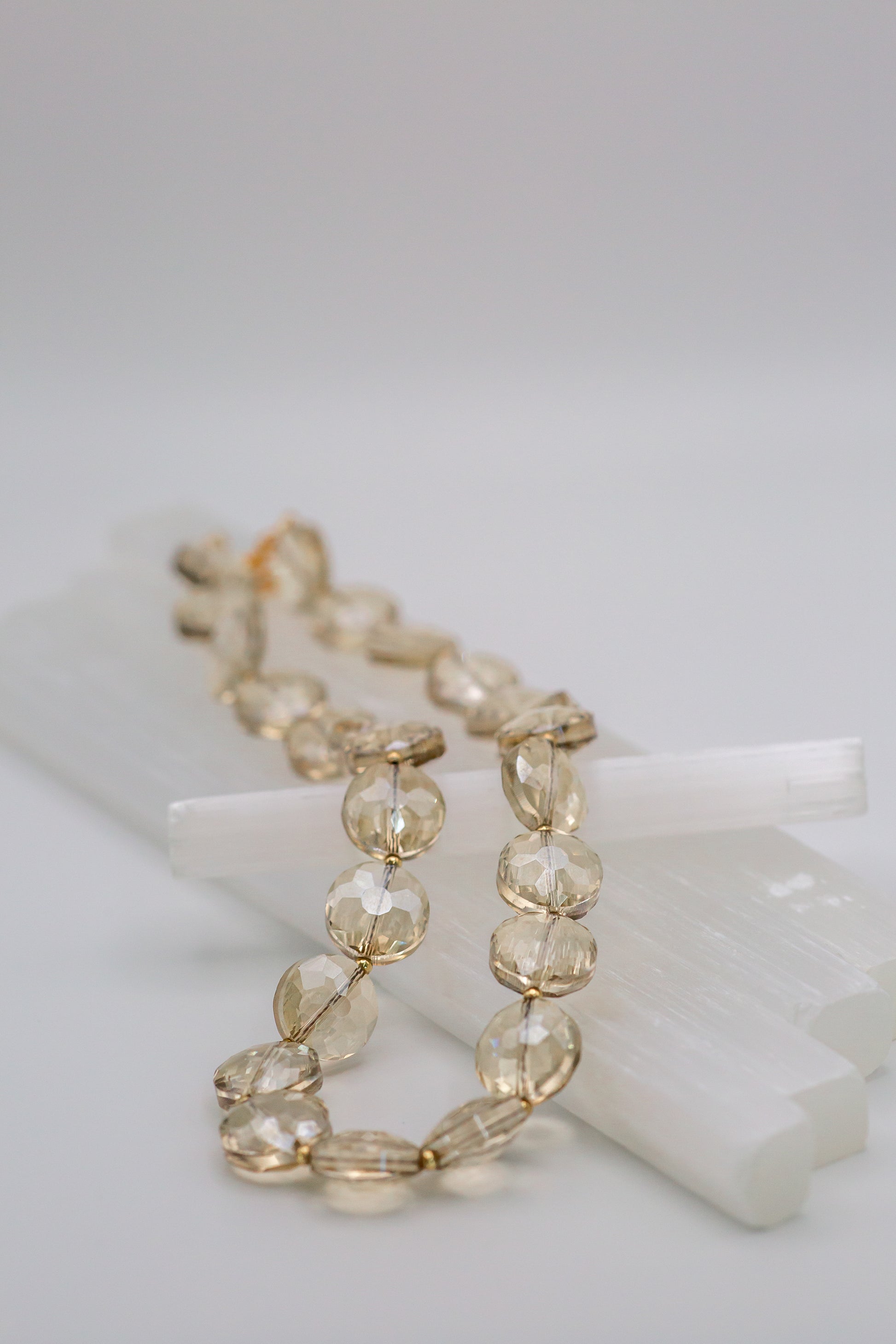 Large faceted flat round 14mm crystals strung with gold beads. The color is a beautiful champagne with a touch of gold. Measures 18".