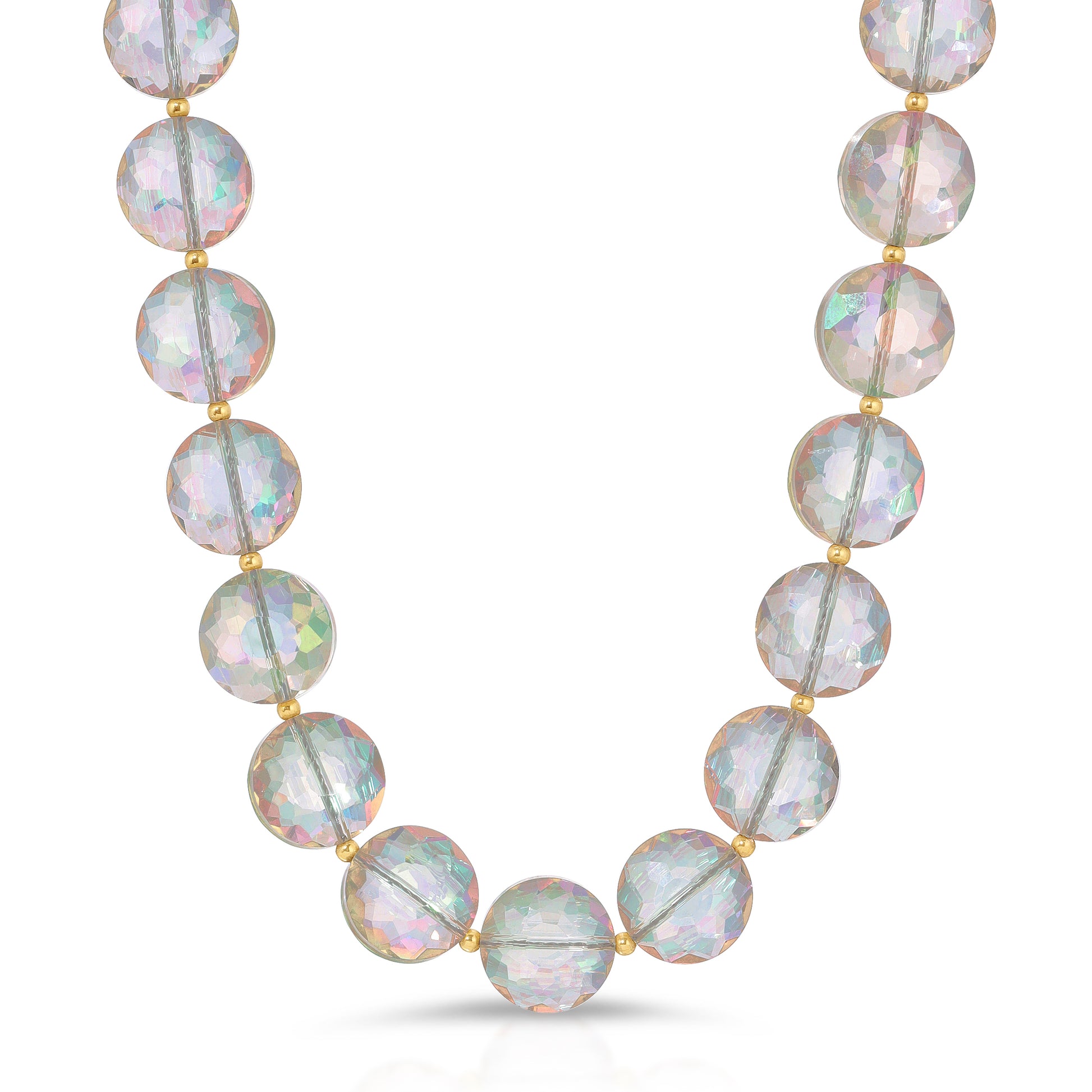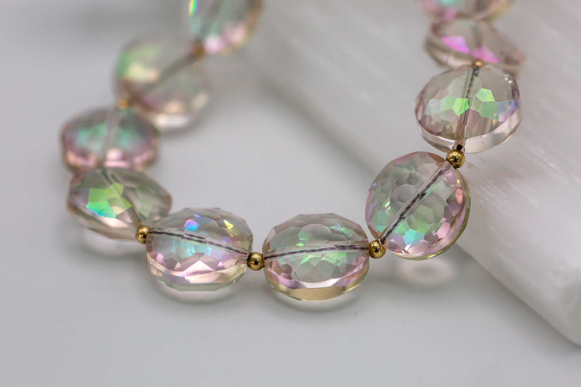 Large faceted flat round 14mm crystals strung with gold beads. The color is a beautiful iridescent clear. Measures 18".