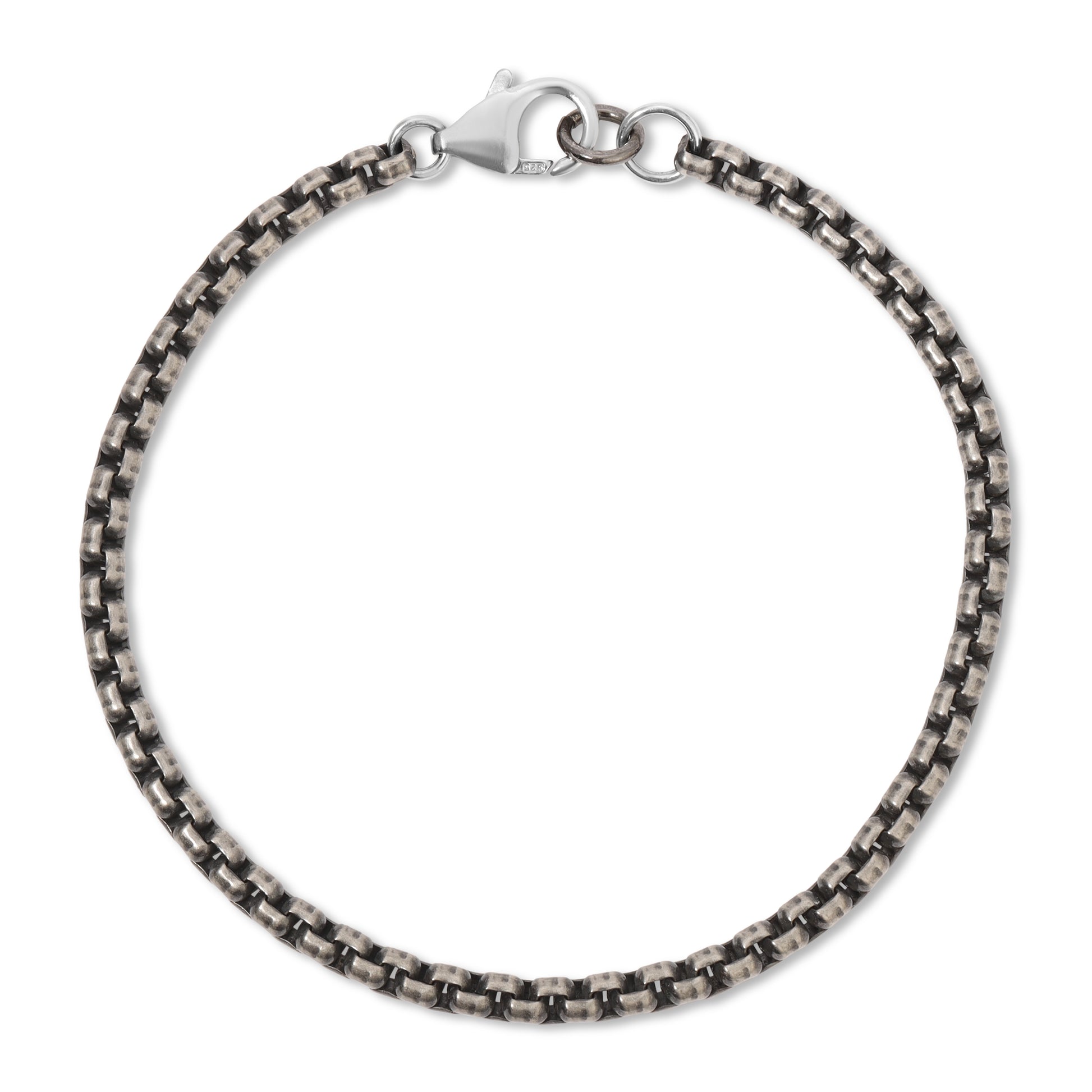 This oxidized sterling silver bracelet for men features a box chain design and measures 4mm in width and 8.25" in length. It is expertly crafted for a stylish and durable accessory.