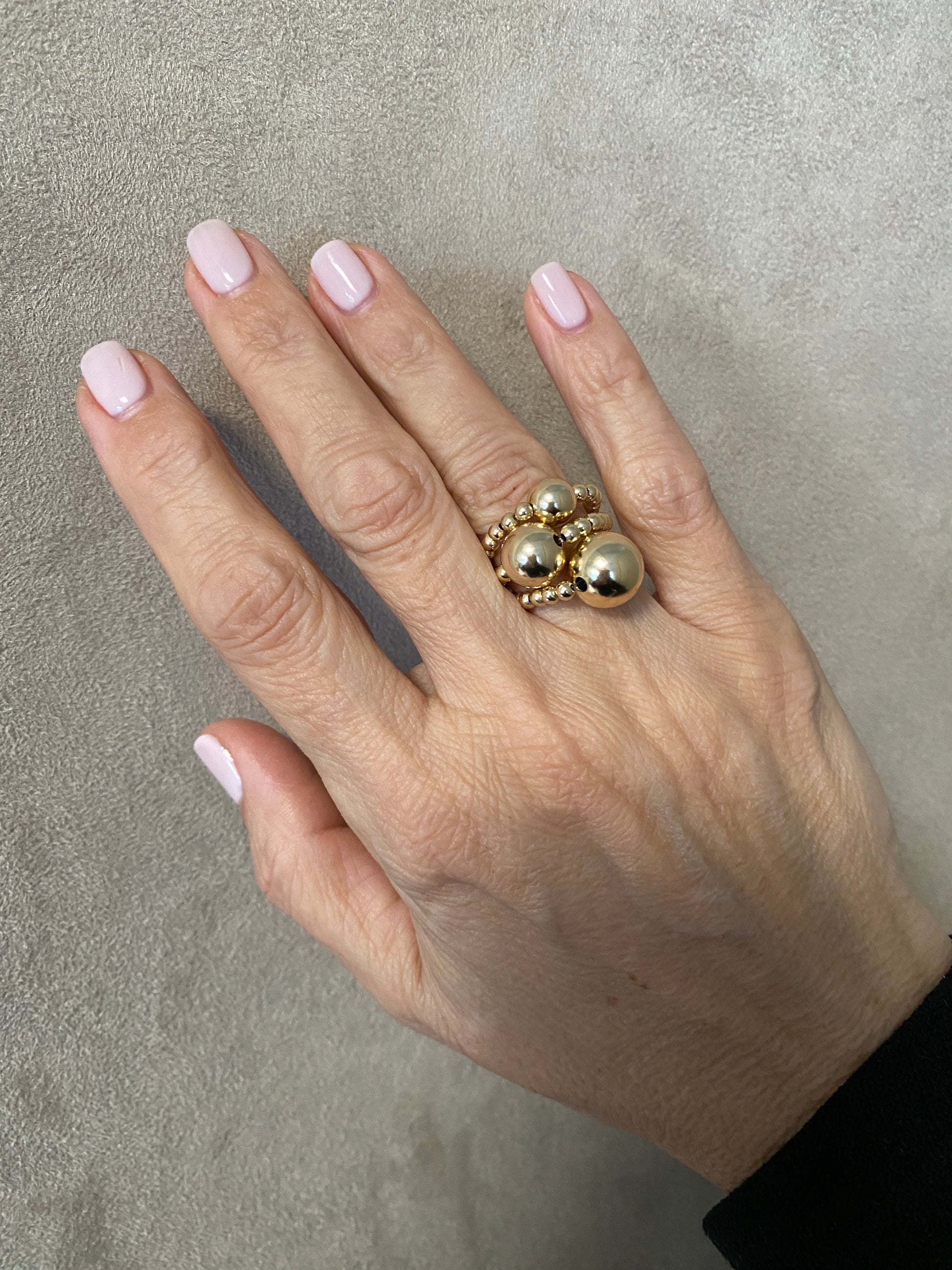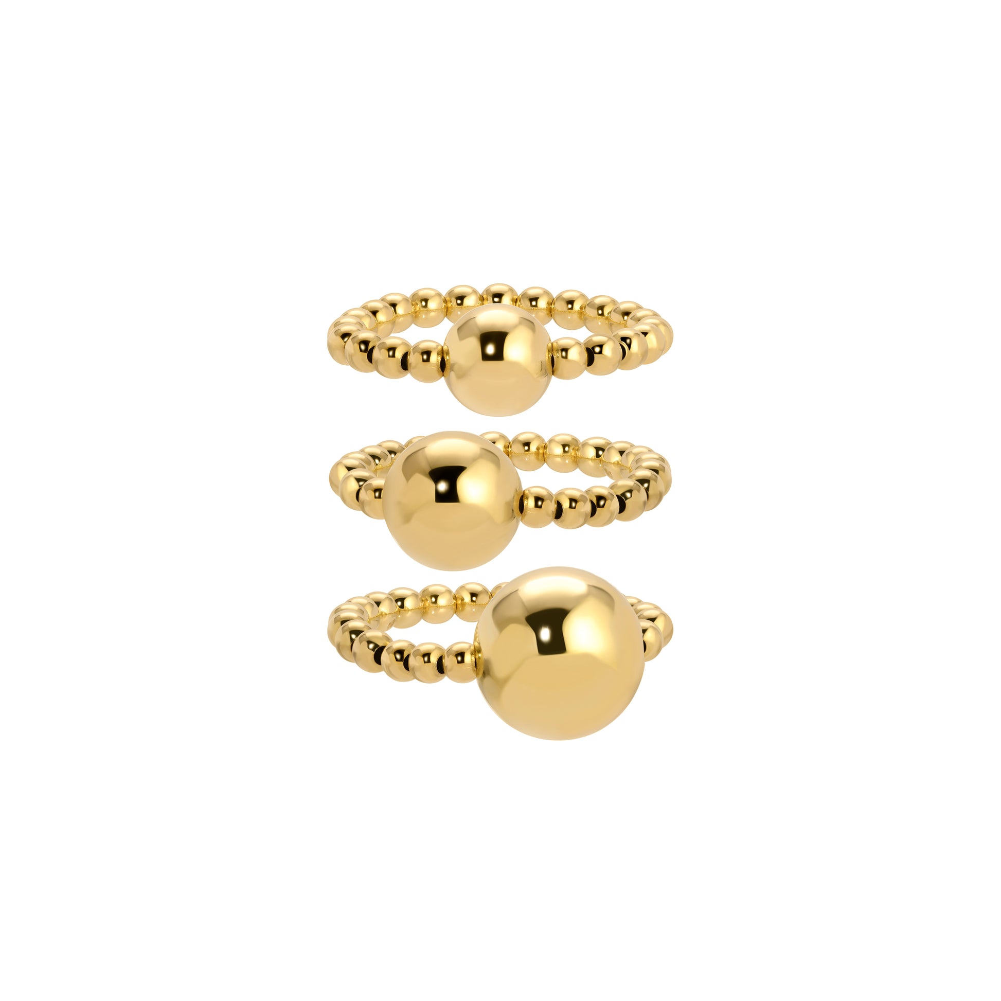 The Bubble ring set features three stretchy stacking rings with 12mm, 10mm, and 8mm Gold sphere accents. Listing is for a set of three rings.