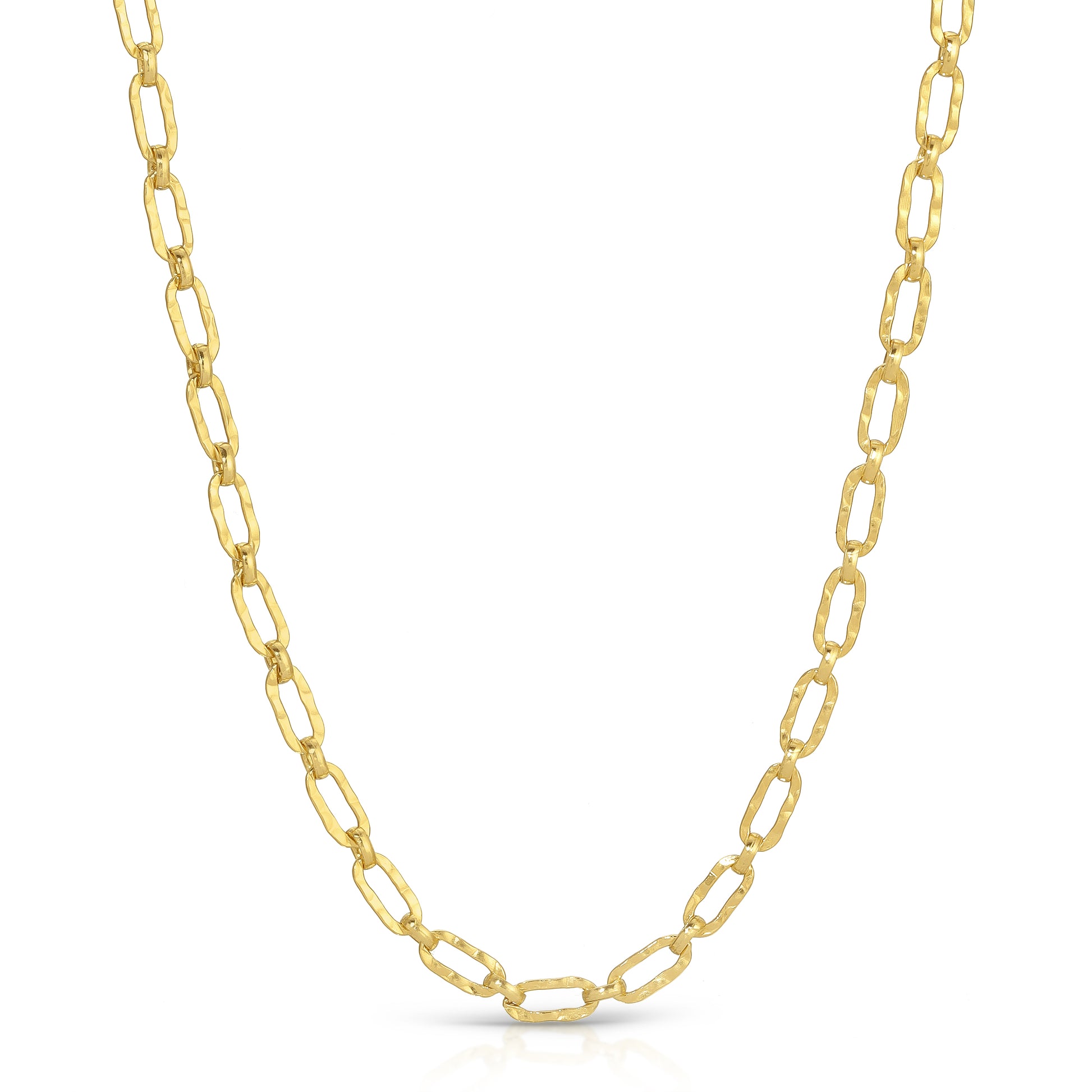 The Eryn necklace features long links with a hammered finish. This stylish piece is made entirely in 14Kt Gold filled and measures 18" from end to end.