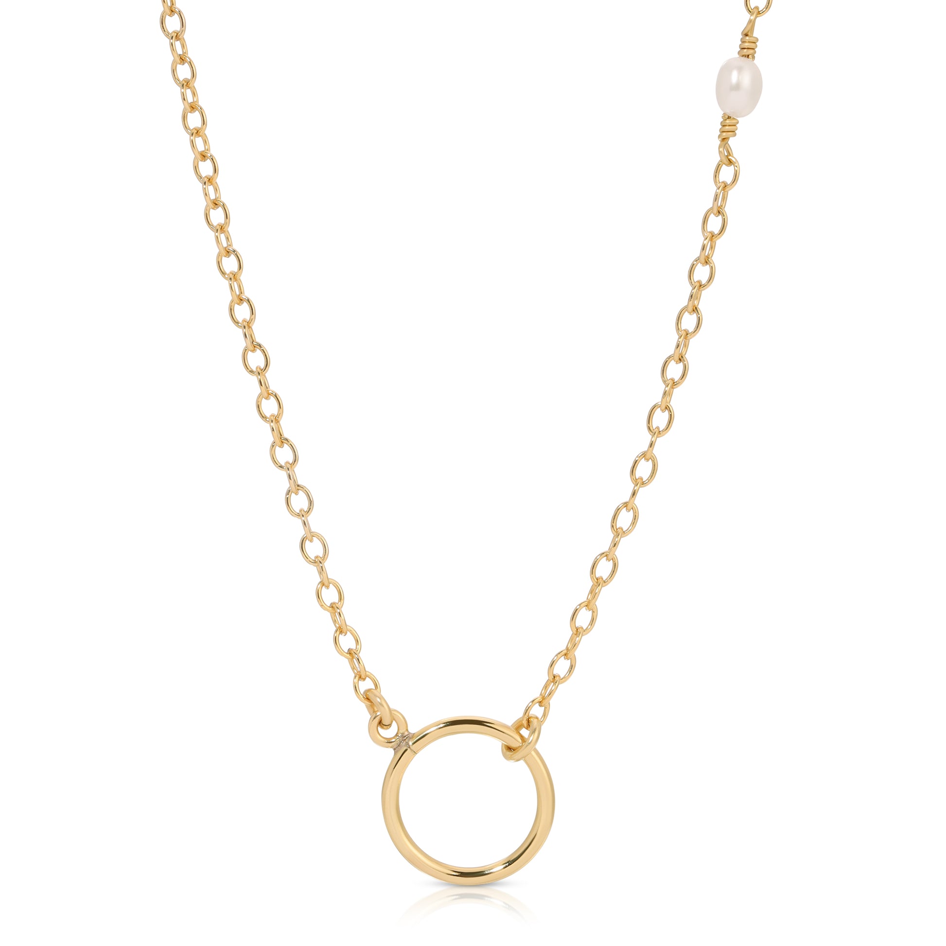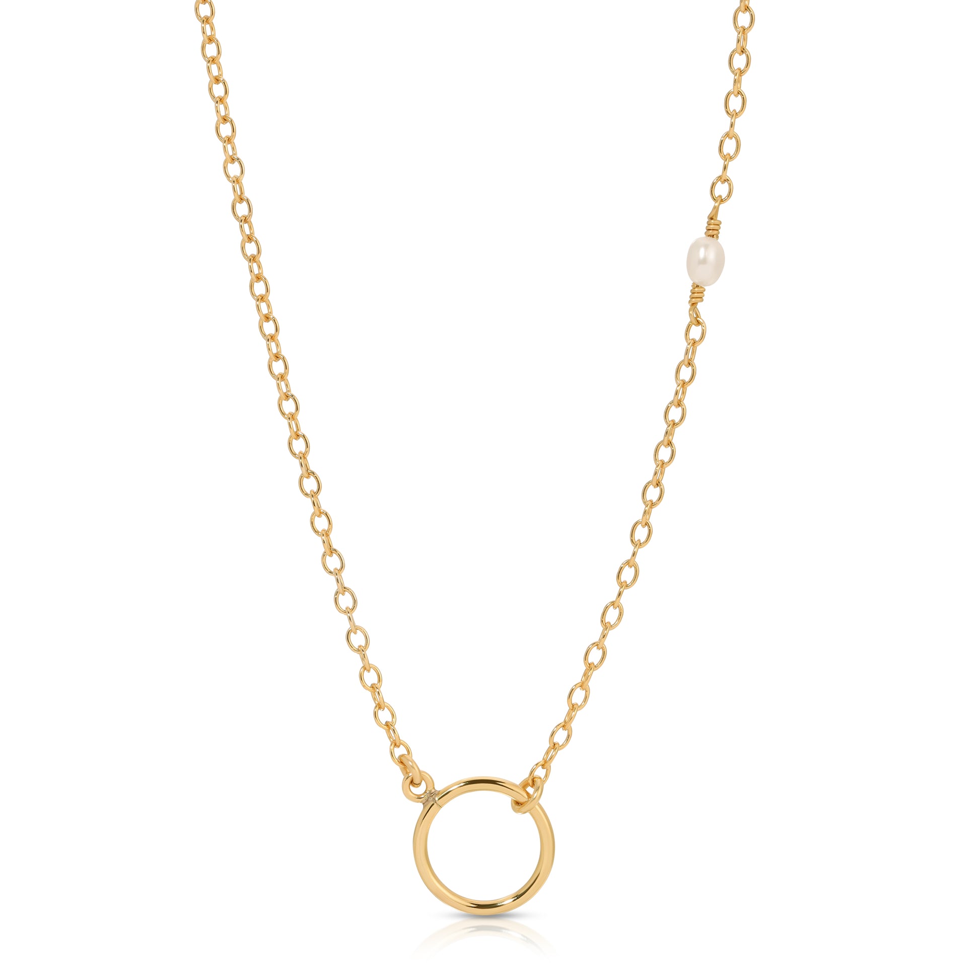 An open circle and an oval freshwater pearl wired into the chain make the Evie necklace an effortless everyday jewelry. Made of 14Kt Gold filled and adjustable from 16" to 18".