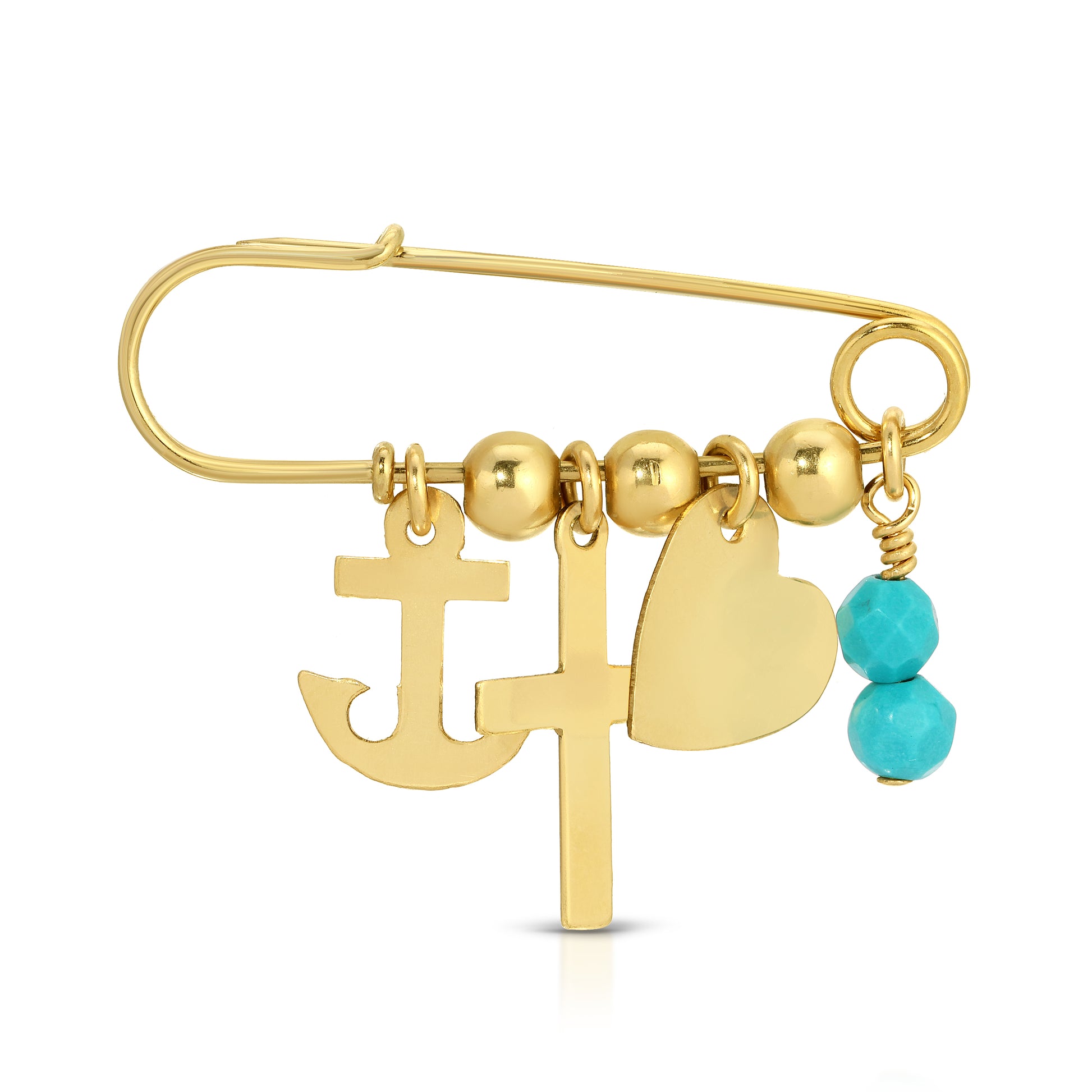 Give the meaningful gift of the three virtues of life,"Hope.Faith.Love". This beautiful pin is made of 14Kt God filled and Genuine turquoise beads. The charms can be removed in the future by a jeweler to be used on a chain.