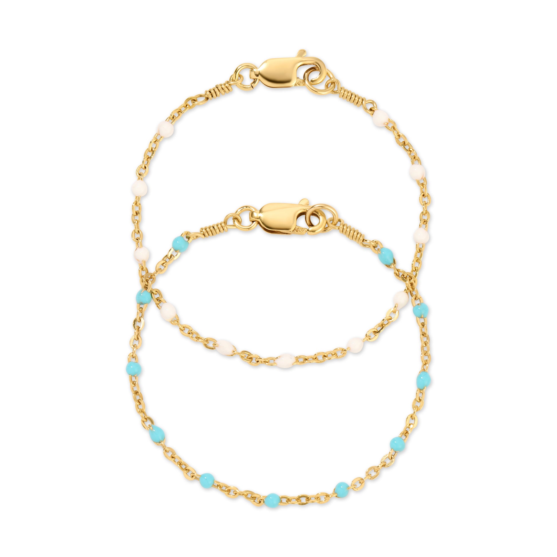 The Fiji Mini bracelet for kids is crafted in 14KT Goldfilled and enamel. Choose from three colors Turquoise, White, Red. Measuring at 5 inches end to end, it is suitable for ages 1 to 4.