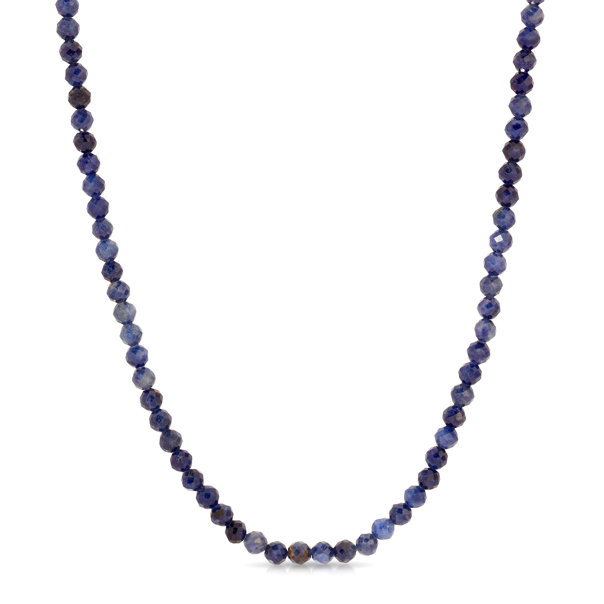 This elegant necklace features hand-strung 2.5mm faceted natural Sapphires and 14KT Gold filled components. It measures 14" in length plus a 2" extension.