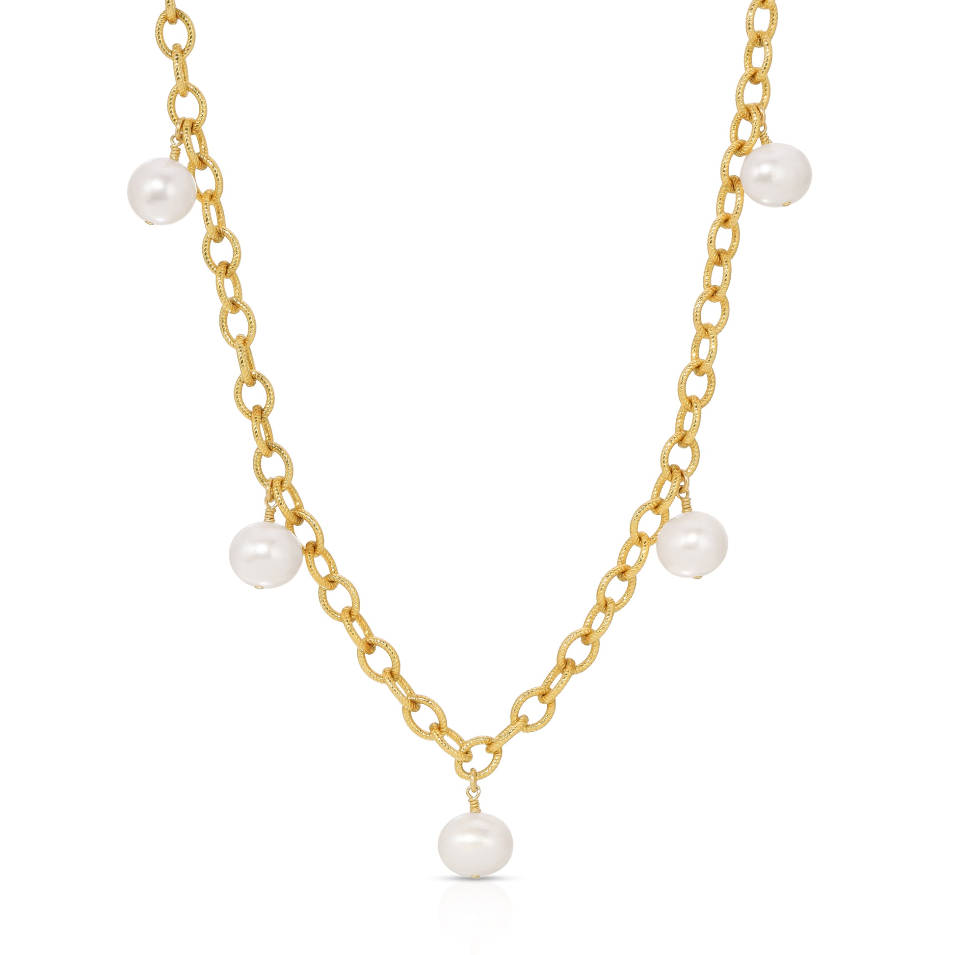 A statement piece, the Maude necklace has five 10-11mm freshwater pearls hanging from a heavy twisted link chain in 14KT Gold filled. Measures 18.5".