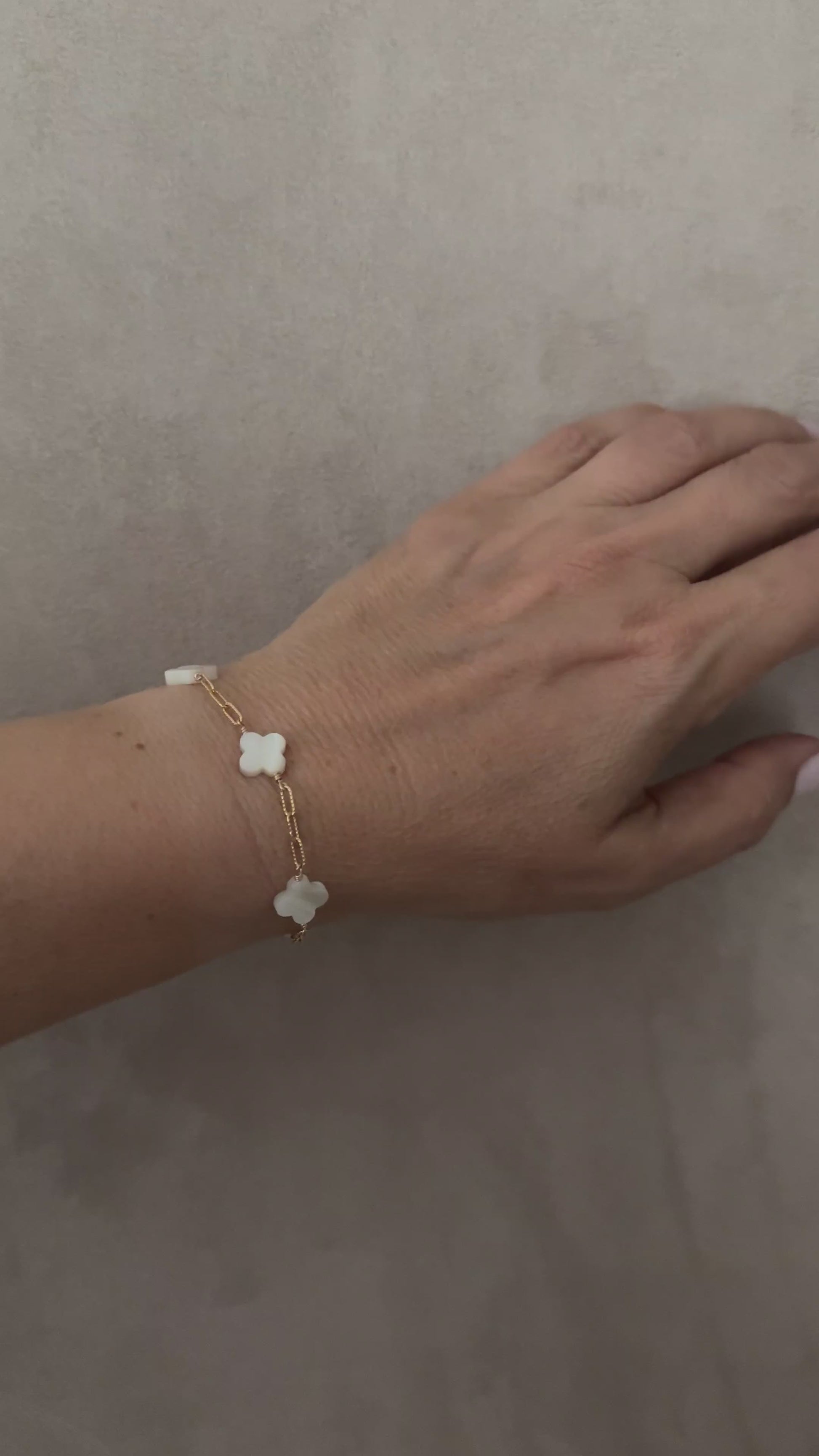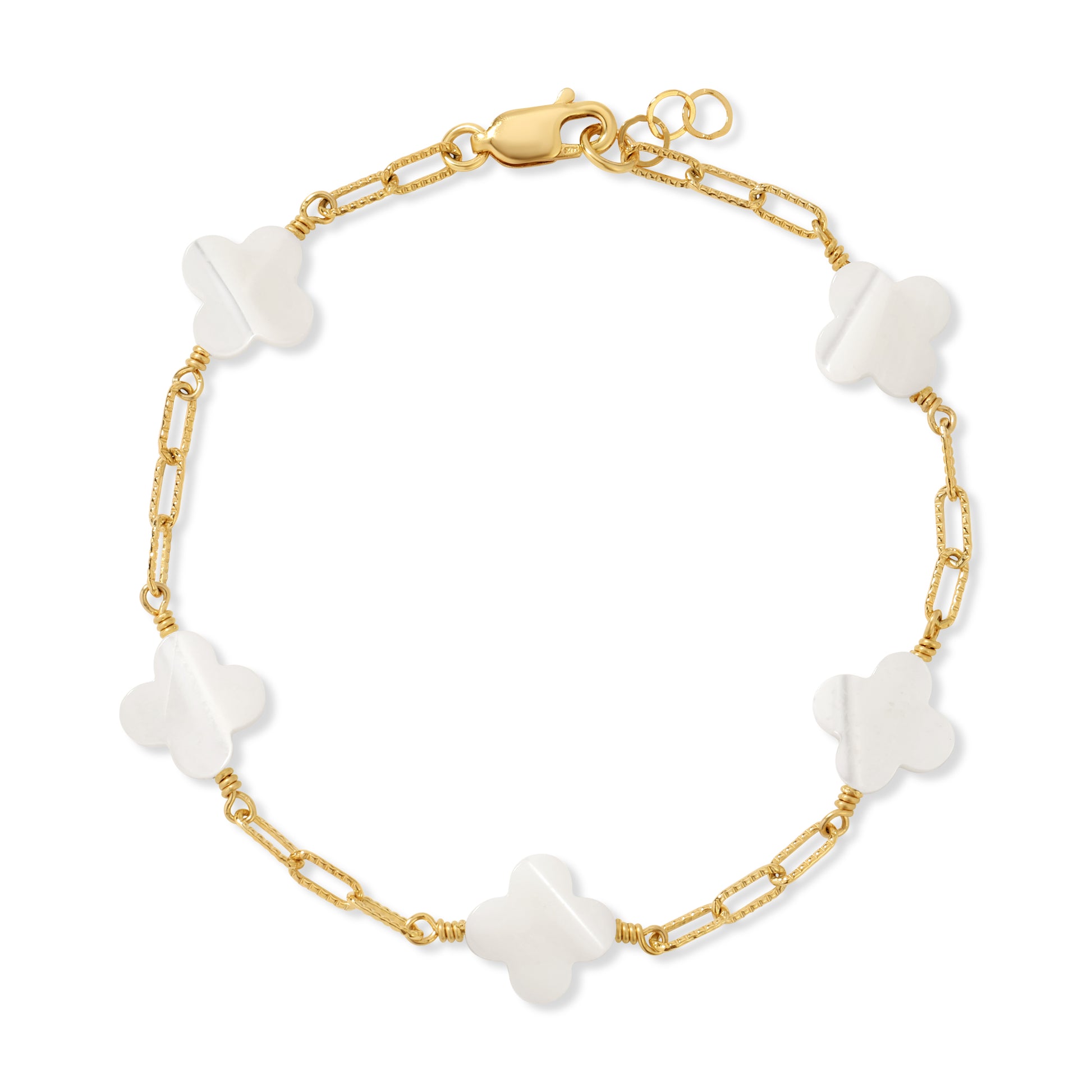 The Silla Bracelet features five natural Mother of Pearl clovers wire wrapped to a beautiful goldfilled chain with textured links. It measures 7.5 inches in length.