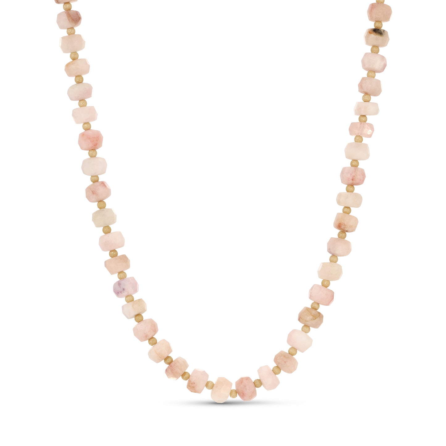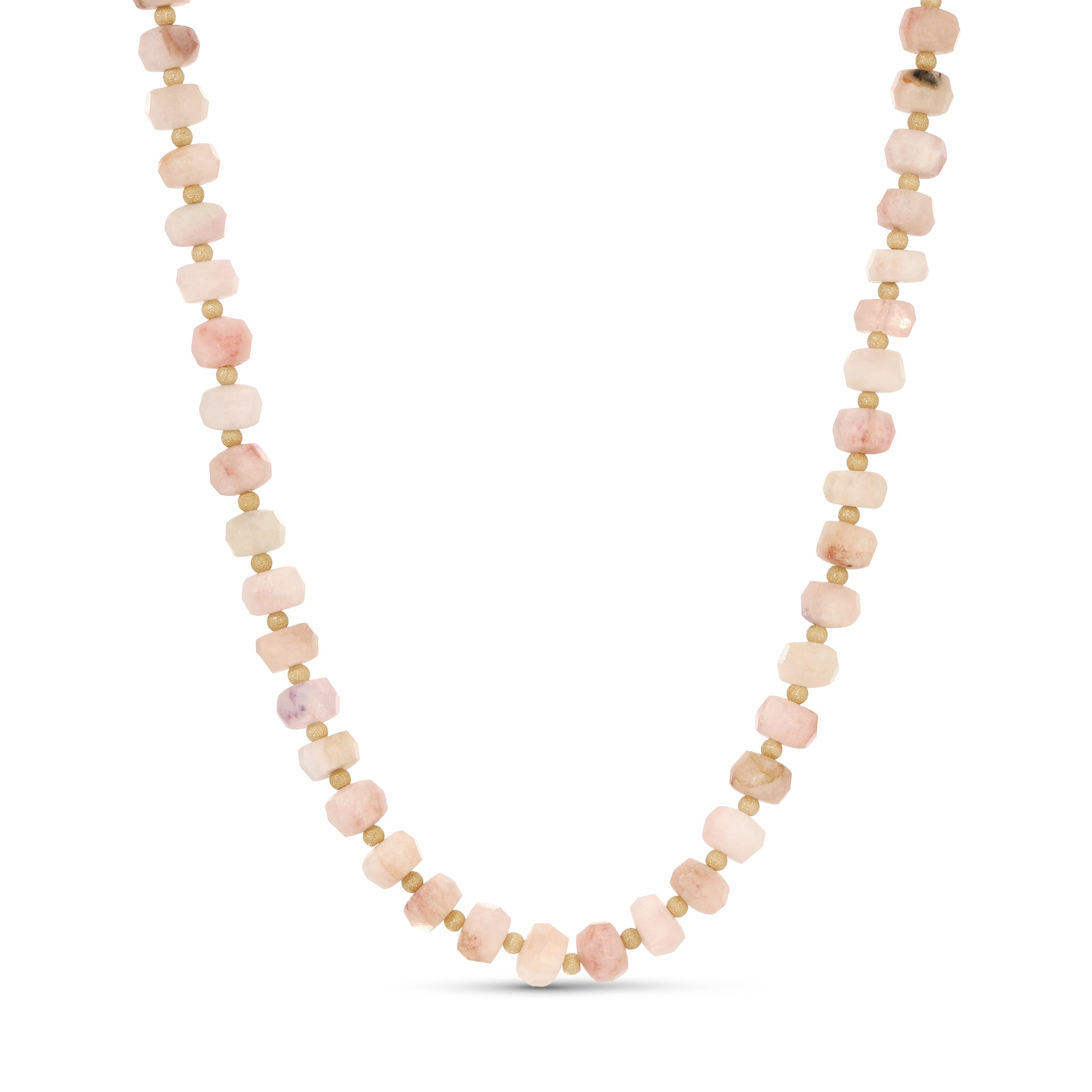 The Sophie necklace features faceted beads of natural morganite and brushed gold finish 14KT Gold filled accents. Its color is a chic blend of blush and pink shades. Measures 16"-17".