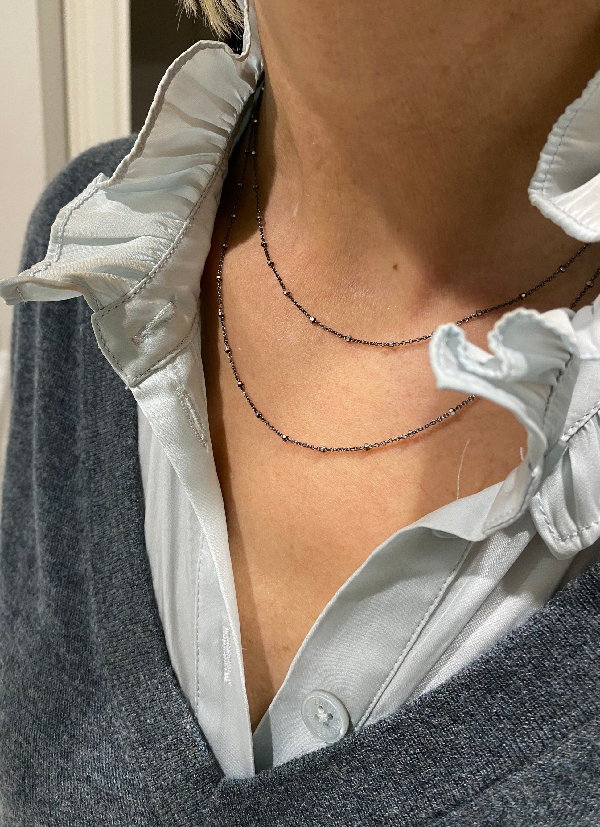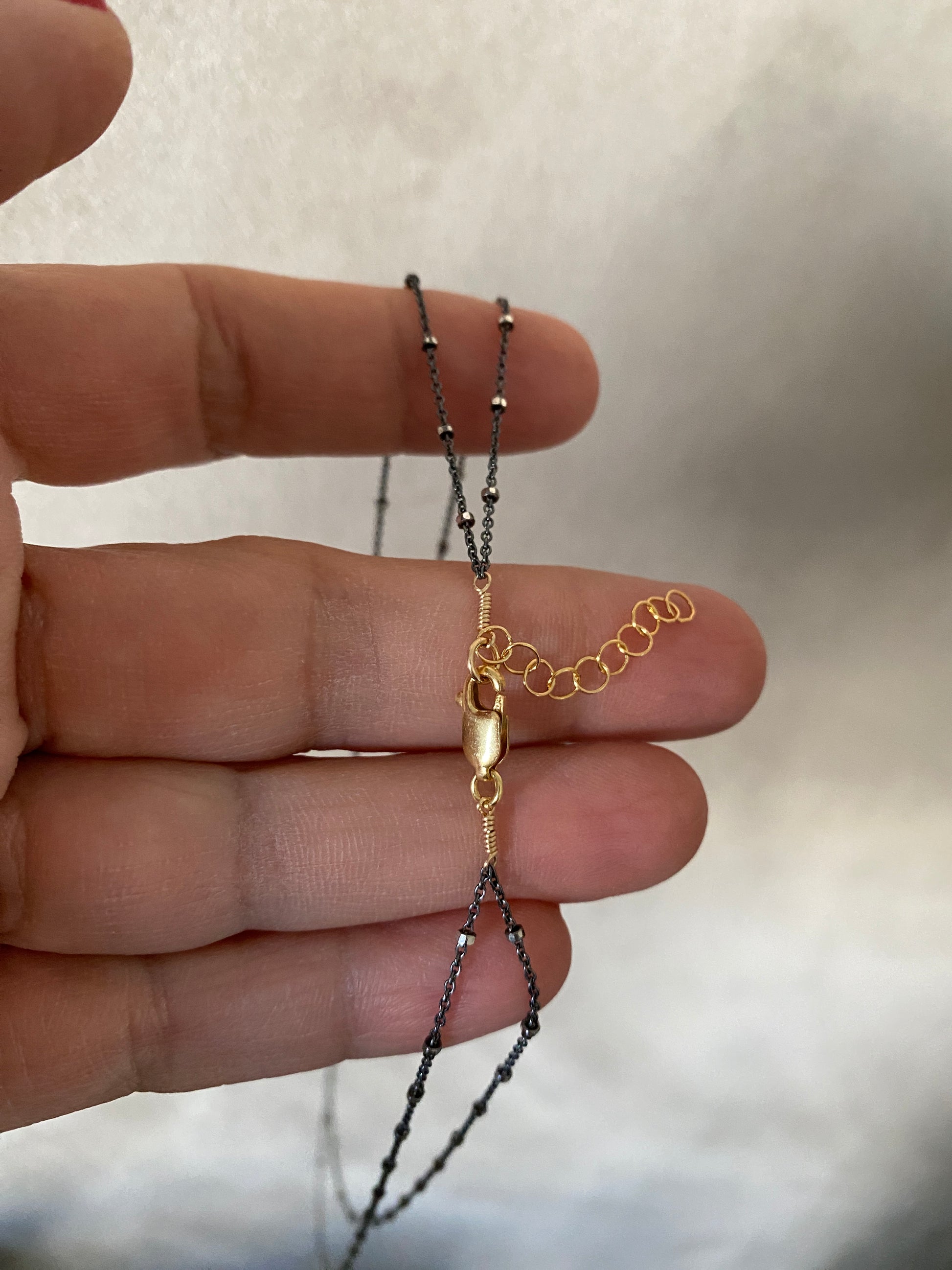 The Stella is a two necklace set that can be worn separately or together to achieve three different looks. Shortest strand 15"-16". Middle strand 16"-17".longest strand 17"-18". All gold components are made of 14KT Gold filled. Chain is made of Black Rhodium Sterling Silver.