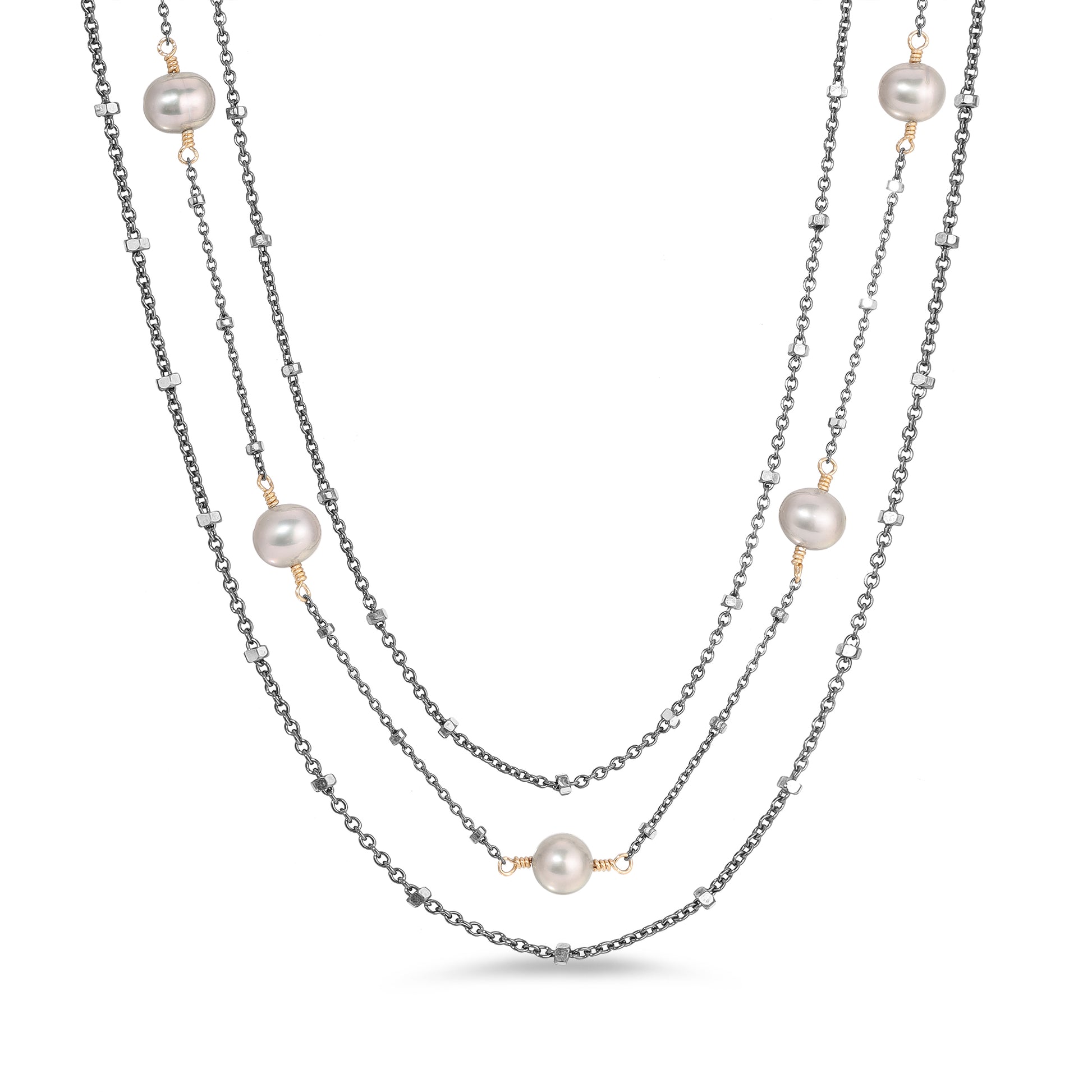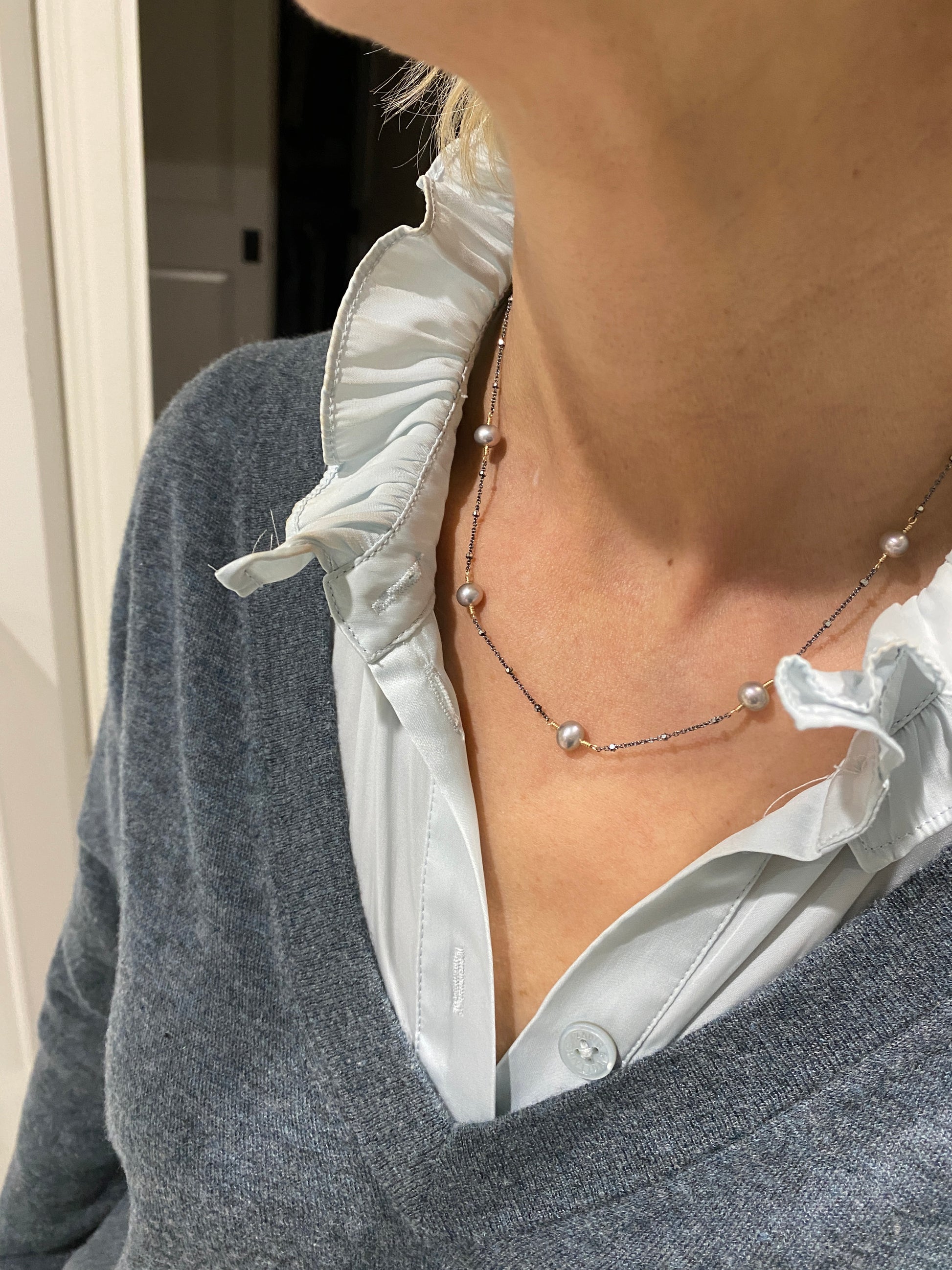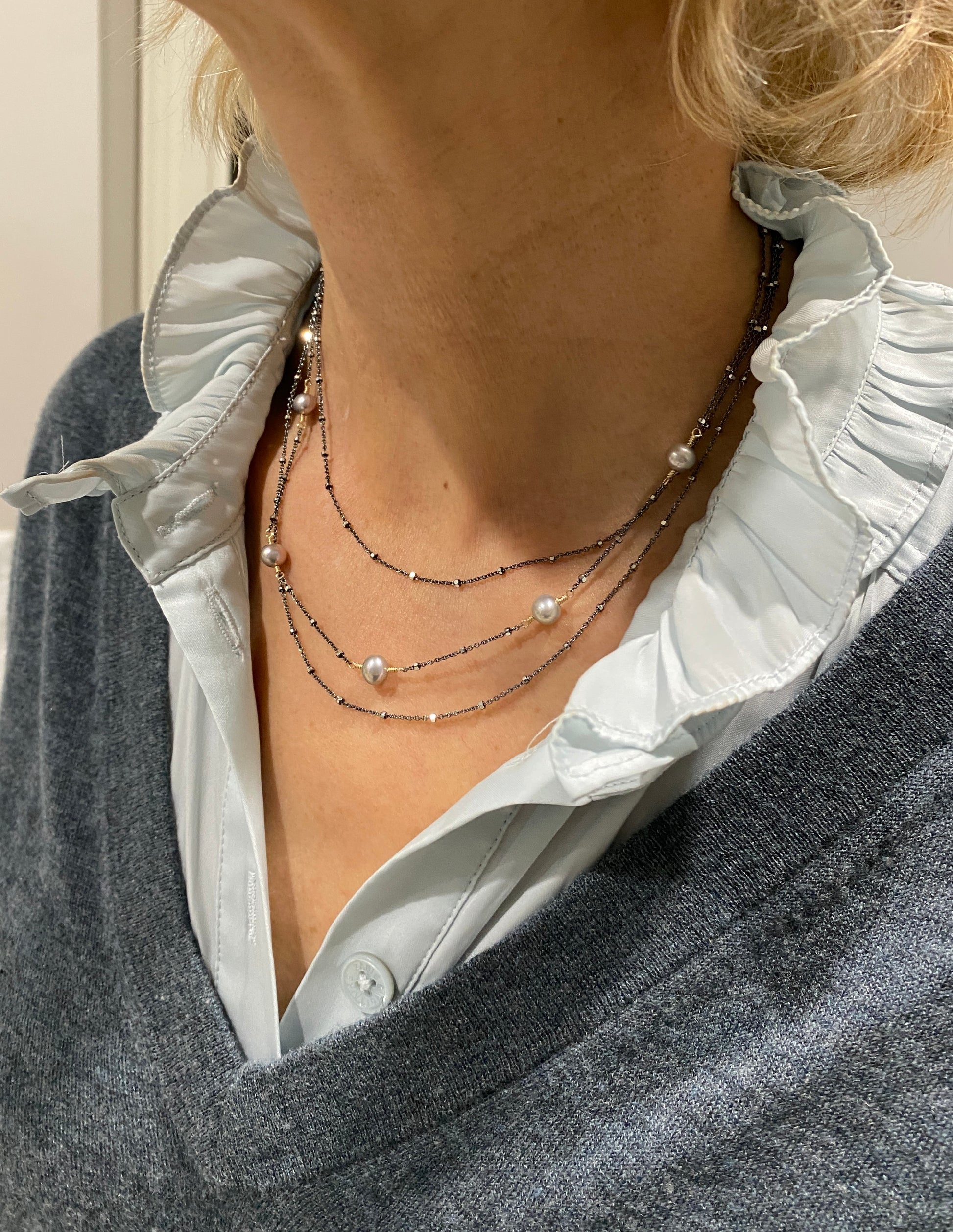 -One Black Rhodium satellite chain necklace studded with grey freshwater pearls.