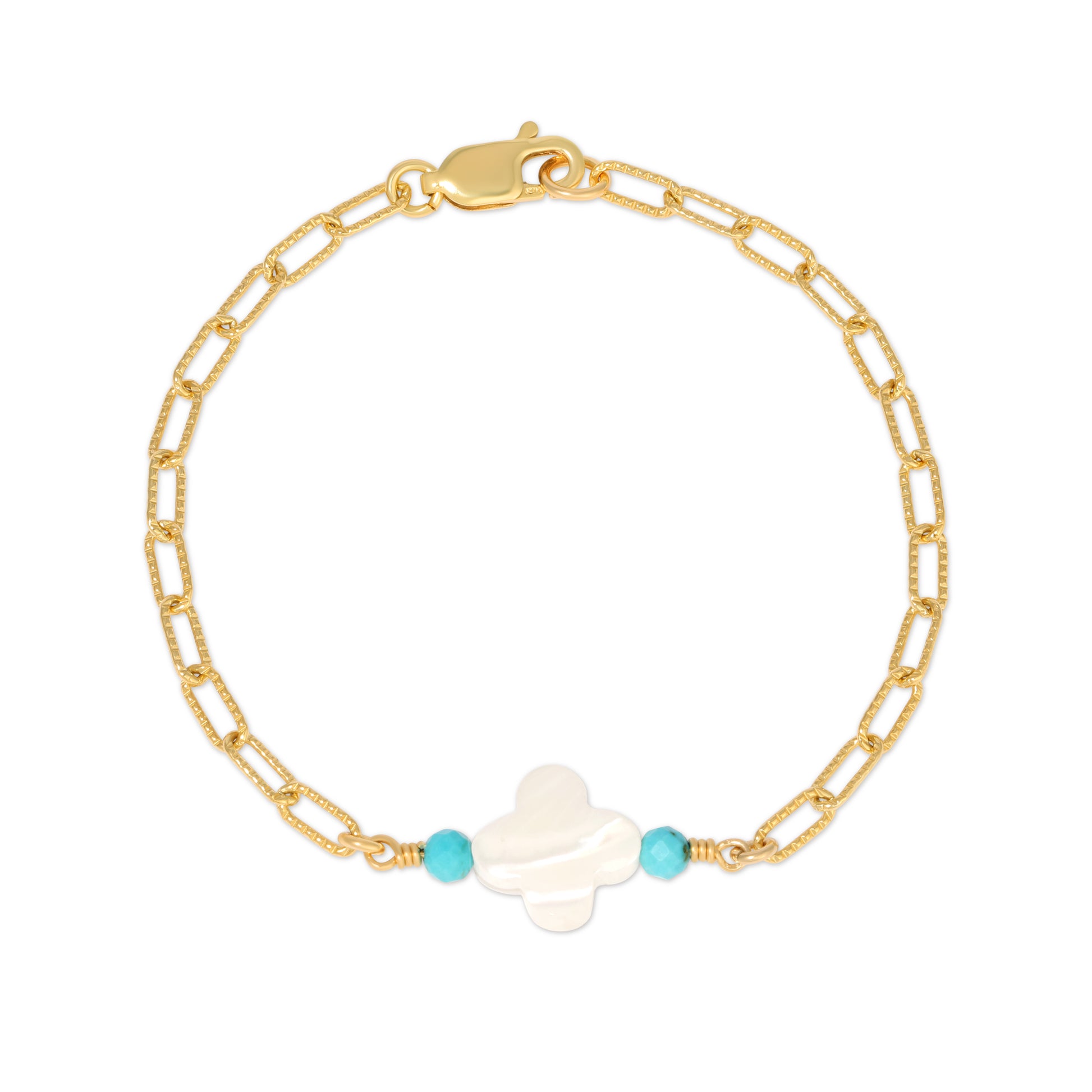 The Dolce bracelet for kids is made with Mother of pearl and Turquoise beads. Measuring at 6" it fits toddlers up to 10 year olds, since clasp can be fastened into the links of the bracelet.